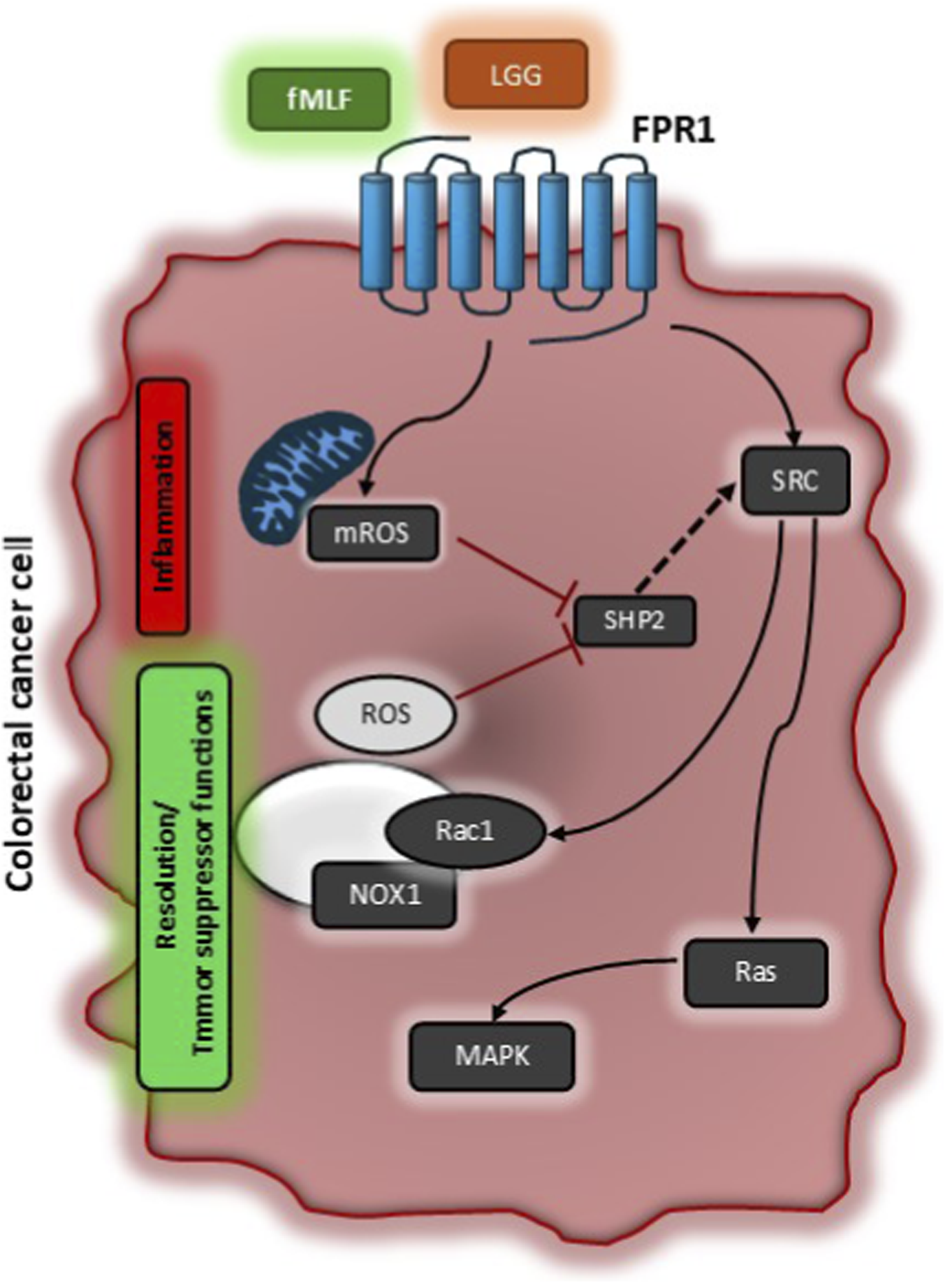 Schematic representation of signaling pathways activated by Formyl Peptide Receptor 1 to exert its tumor suppressor function. In colorectal carcinoma cells, activation of FPR1 by formylated peptides (e.g., fMLF) or bacterial supernatants (e.g., LGG – Lactobacillus Rhamnosus) induces a first rapid mitochondrial ROS production (mROS) which is responsible for SHP2 phosphatase inhibition. SHP2 inhibition allows SRC activation which controls the activity of Rac1 and RAS. Rac1 completes NOX1 multicomplex activation sustaining a second wave of NOX1-dependent ROS that reinforce this signaling cycle. RAS classically aids MAPK signaling. The first rapid ROS production by mitochondria is responsible for inflammatory responses (i.e., COX2 expression and PGD2 production), while NOX1-dependent ROS are associated to resolution responses (i.e., ALOXs induction and SPM release) and thus for tumor suppressor properties of FPR1.