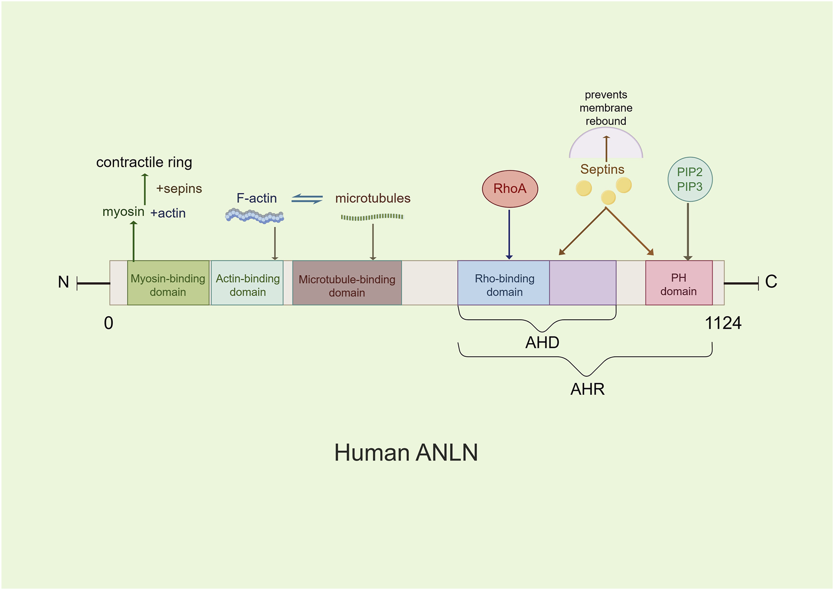 The main molecular structure model of the ANLN. ANLN contains several conserved domains, including a myosin II-binding domain, an actin-binding domain, an Anillin Homology Domain (AHD), and a pleckstrin homology domain(PH). These domains mediate interactions with cytoskeletal components and regulatory proteins involved in cytokinesis.