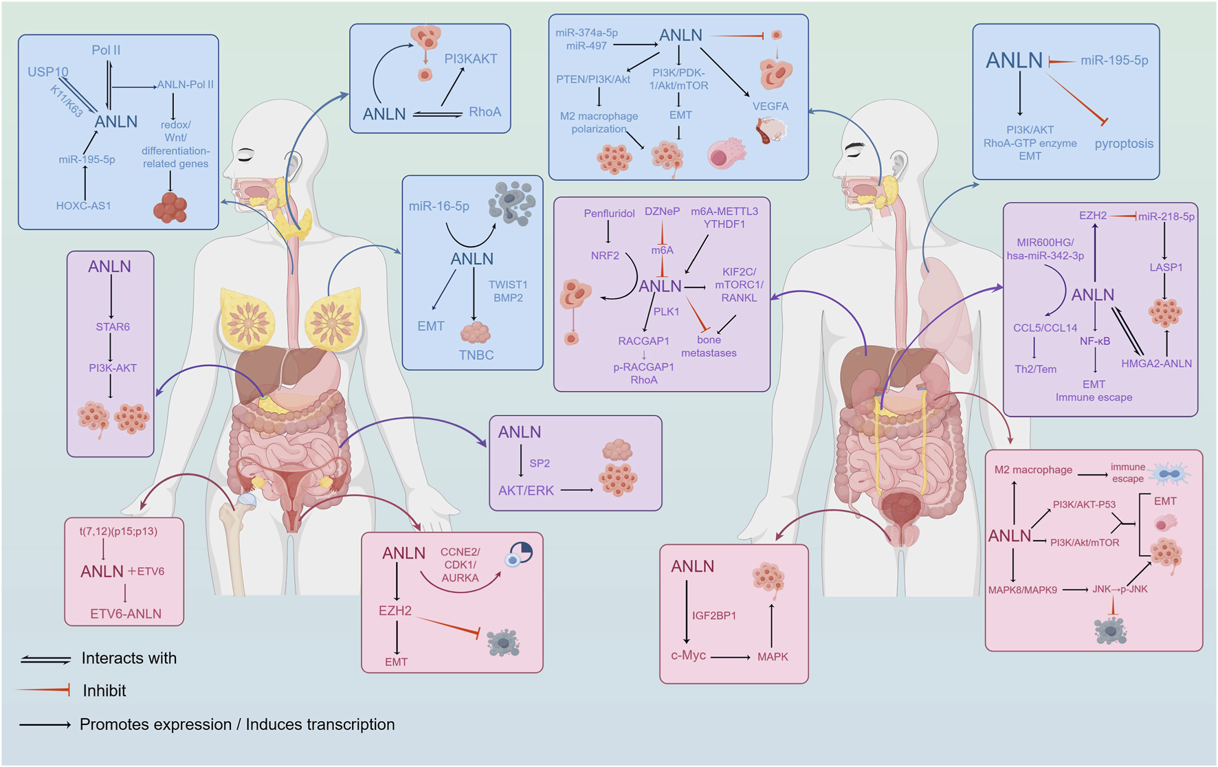 Cancer arises from uncontrolled cell proliferation resulting from dysregulated signaling pathways. As a key regulatory factor in cytokinesis, ANLN is aberrantly expressed in a wide range of human cancers (Figure 2; Table 1). Pan-cancer analyses based on the TCGA database, along with multiple independent studies, have demonstrated that ANLN is overexpressed in diverse malignancies, including cancers of the lung, breast, liver(hepatocellular carcinoma), pancreas, and prostate, among others, suggesting its involvement in tumorigenesis and disease progression. Meanwhile, elevated ANLN expression is significantly associated with adverse clinicopathological features. High ANLN levels strongly correlate with increased tumor migration, invasion, metastasis, and poor clinical outcomes, making it a potential prognostic biomarker with broad predictive value across multiple cancer types. Notably, its oncogenic effects are not mediated through a single pathway but are driven by a complex network of interconnected core molecules.