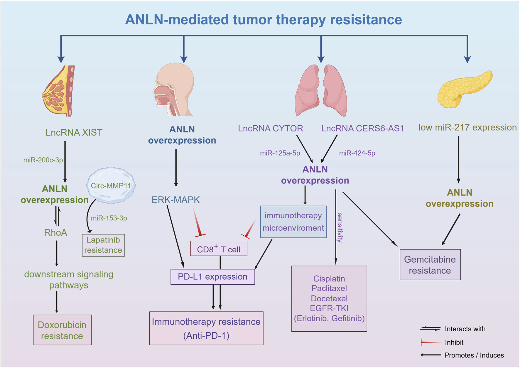 In addition, various non-coding RNAs have been found to promote chemotherapy resistance by regulating ANLN expression, with resistance mechanisms confirmed in drugs such as Paclitaxel, Gemcitabine, Doxorubicin, Imatinib, and Lapatinib (Chen et al., 2025; Yang et al., 2022). CYTOR, an oncogenic long non-coding RNA(LncRNA), functions as a competitive endogenous RNA(ceRNA) to upregulate ANLN expression by adsorbing miR-125a-5p, inhibiting its degradation, and thereby promoting Gemcitabine resistance in LUAD (Cao et al., 2024). XIST, another LncRNA, also promotes chemotherapy resistance in breast cancer cells to Doxorubicin by competitively binding miR-200c-3p and relieving the inhibition of ANLN (Zhang M. et al., 2020). Circular RNA(CircRNA) Circ-MMP11 contributes to metastasis via exosomes in breast cancer cells, adsorbing miR-153-3p to upregulate ANLN expression, thereby promoting Lapatinib resistance (Wu et al., 2021).