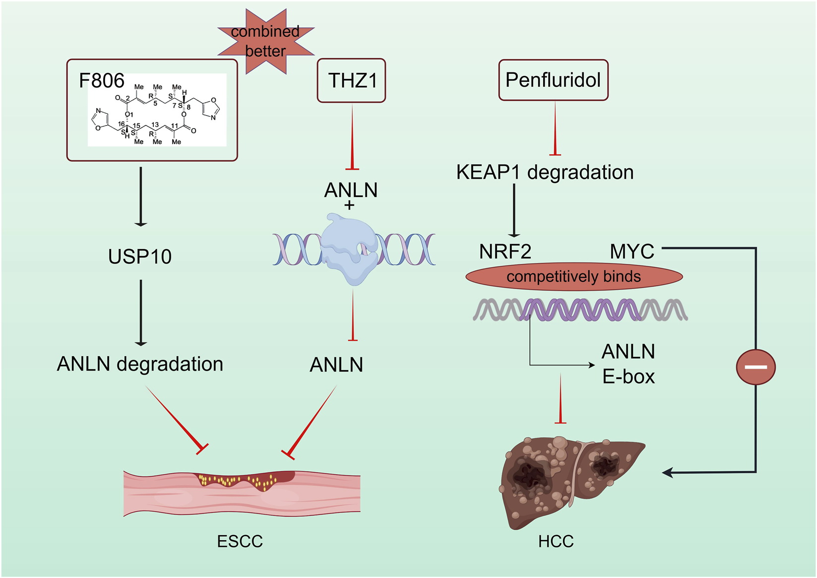 ANLN also plays a key role in other drug-targeting strategies. The macrolide compound FW-04-806(F806), a potential treatment for ESCC, inhibits ESCC cell division by targeting USP10 and promoting ANLN degradation. F806 selectively targets USP10 without affecting Cdh1-ANLN binding, altering the USP10-Cdh1-ANLN complex balance. Additionally, the super-enhancer inhibitor THZ1 specifically inhibits ANLN-Pol II aggregation, suppressing ESCC development, while the combined effect of F806 and THZ1 exceeds their individual effects (Cao et al., 2025; Figure 4).