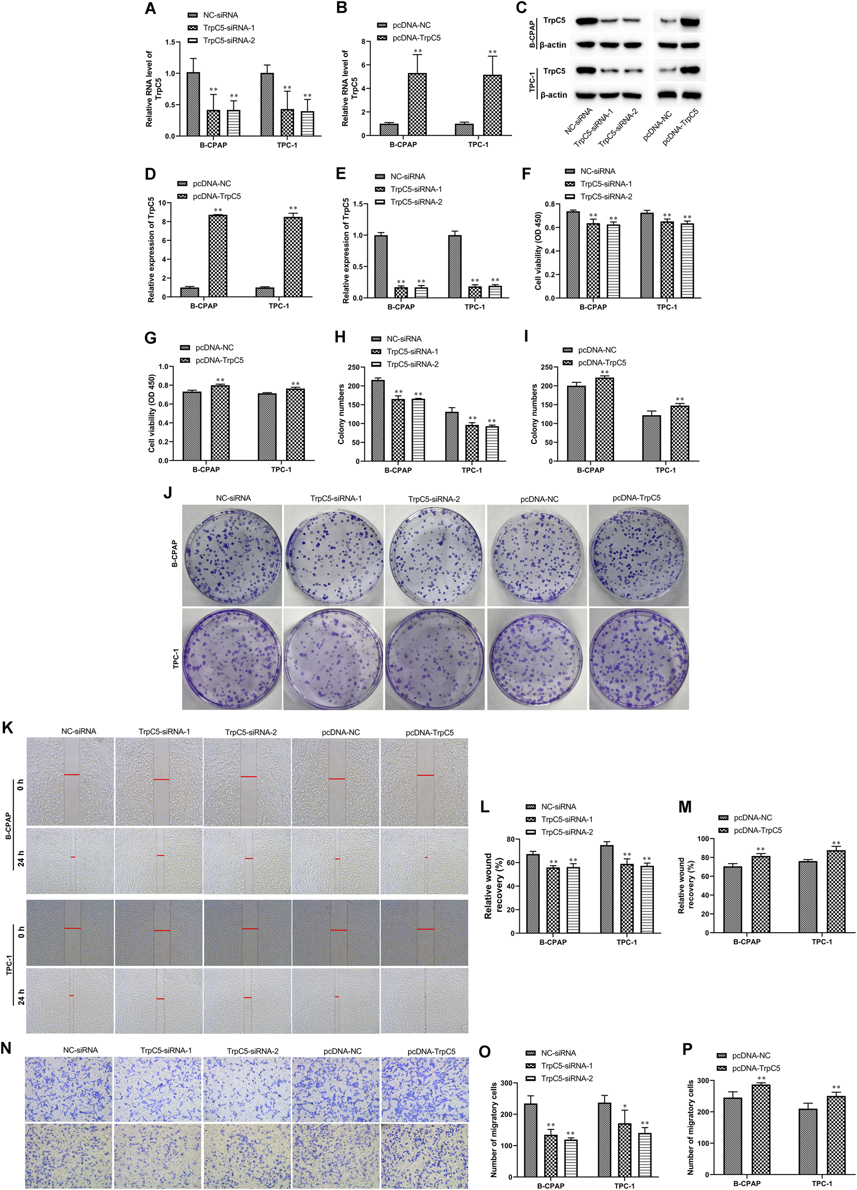 TrpC5 regulated PTC cell proliferation. (A,B) The mRNA level of TrpC5 in TPC-1 and B-CPAP cells was evaluated using RT-qPCR. (C–E) The protein level of TrpC5 in TPC-1 and B-CPAP cells was determined using Western blot analysis. (F–J) The effect of TrpC5 silencing or overexpression on the growth of TPC-1 and B-CPAP cells was detected using CCK-8 and colony formation assays. (K–M) The effect of TrpC5 silencing or overexpression on TPC-1 and B-CPAP cell invasion was detected by Wound-healing assay. (N–P) Transwell analysis was performed in TPC-1 and B-CPAP cells transfected with TrpC5-siRNA or pcDNA-TrpC5. Values represent the mean ± SD. **p < 0.01 vs. NC-siRNA or pcDNA-NC.