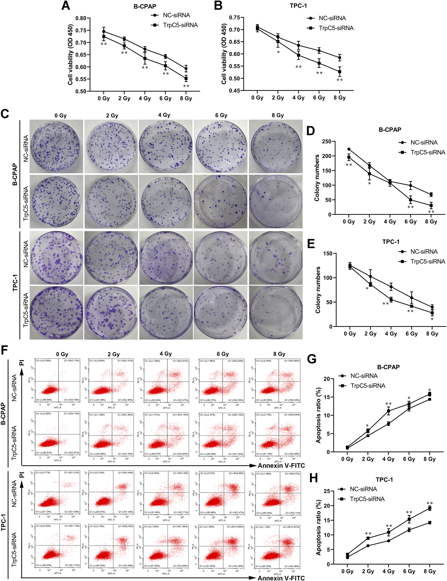 TrpC5 silencing enhanced radiosensitivity of PTC cells. TPC-1 and B-CPAP cells were transfected with NC-siRNA or TrpC5-siRNA for 48 h. (A–E) The transfected TPC-1 and B-CPAP cells were exposed to different doses of IR (0, 2, 4, 6, and 8 Gy), and survival fraction was detected using CCK-8 and colony formation assays. (F–H) The transfected TPC-1 and B-CPAP cells were treated with IR (0, 2, 4, 6, and 8 Gy), followed by the measurement of the cell apoptosis rate using flow cytometry analysis. Values represent the mean ± SD. *p < 0.05 and **p < 0.01 vs. NC-siRNA.