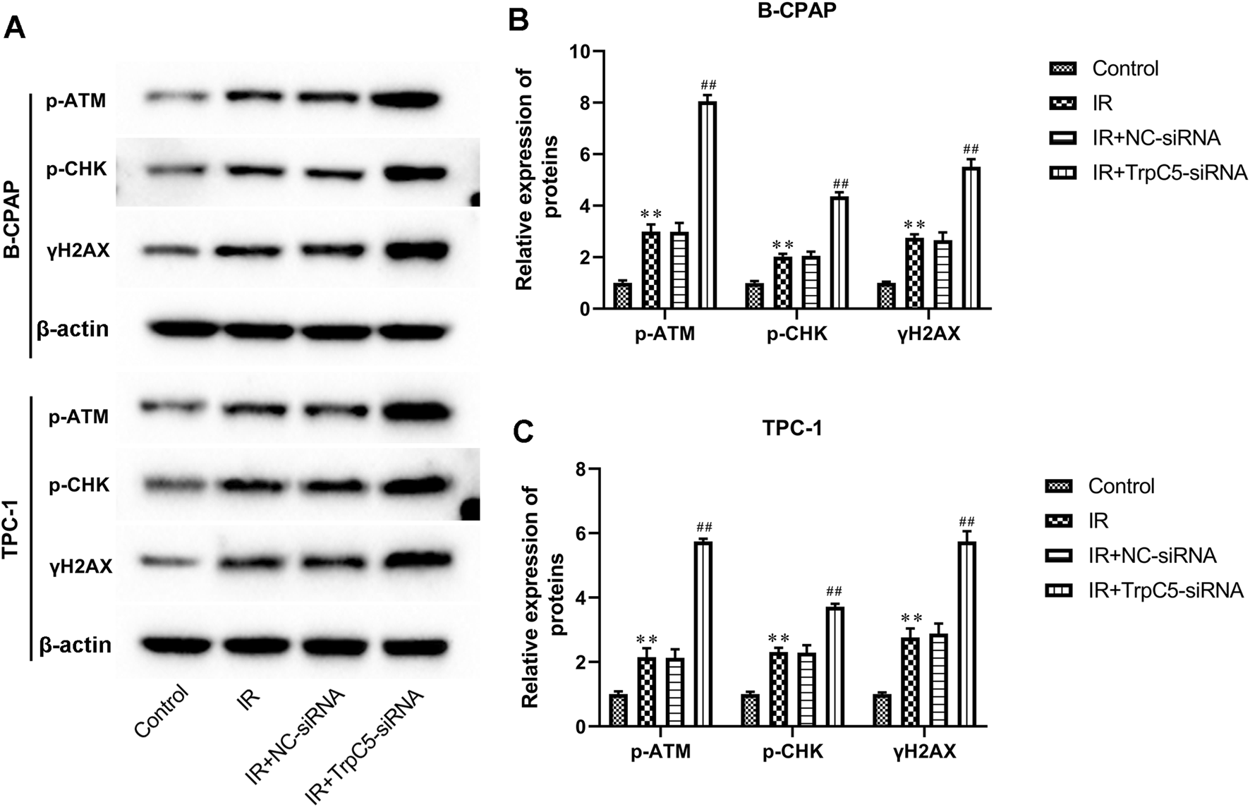 TrpC5 silencing enhanced DNA damage-related proteins in PTC cells under IR treatment. TPC-1 and B-CPAP cells were transfected with NC-siRNA or TrpC5-siRNA for 48 h. Then, the transfected TPC-1 and B-CPAP cells were treated with 2 Gy. (A–C) The protein expressions of p-ATM, p-CHK, and γH2AX in TPC-1 and B-CPAP cells were evaluated using Western blot analysis. Values represent the mean ± SD. **p > 0.01 vs. control; ##p > 0.01 vs. IR + NC-siRNA.