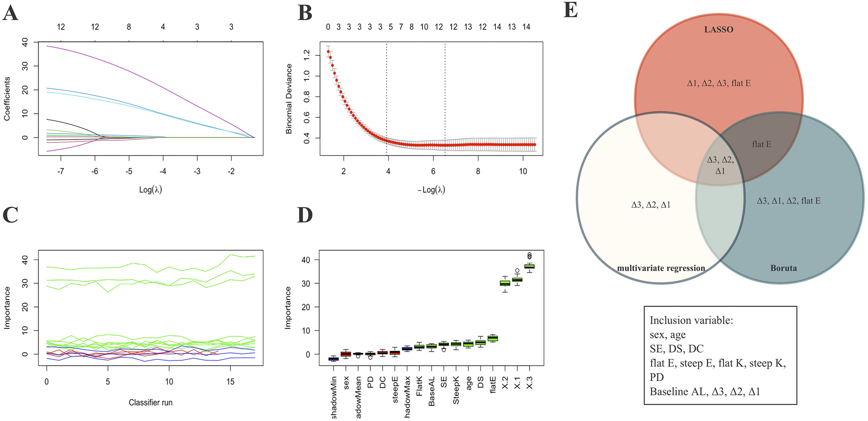 Variable selection process. (A,B) Visualization of feature selection using the LASSO method. (C,D) Visualization of feature selection using the Boruta method. (E) Venn diagram showing the final four variables selected for the predictive model based on three variable screening methods. X1: Δ1; X2: Δ2; X3: Δ3.