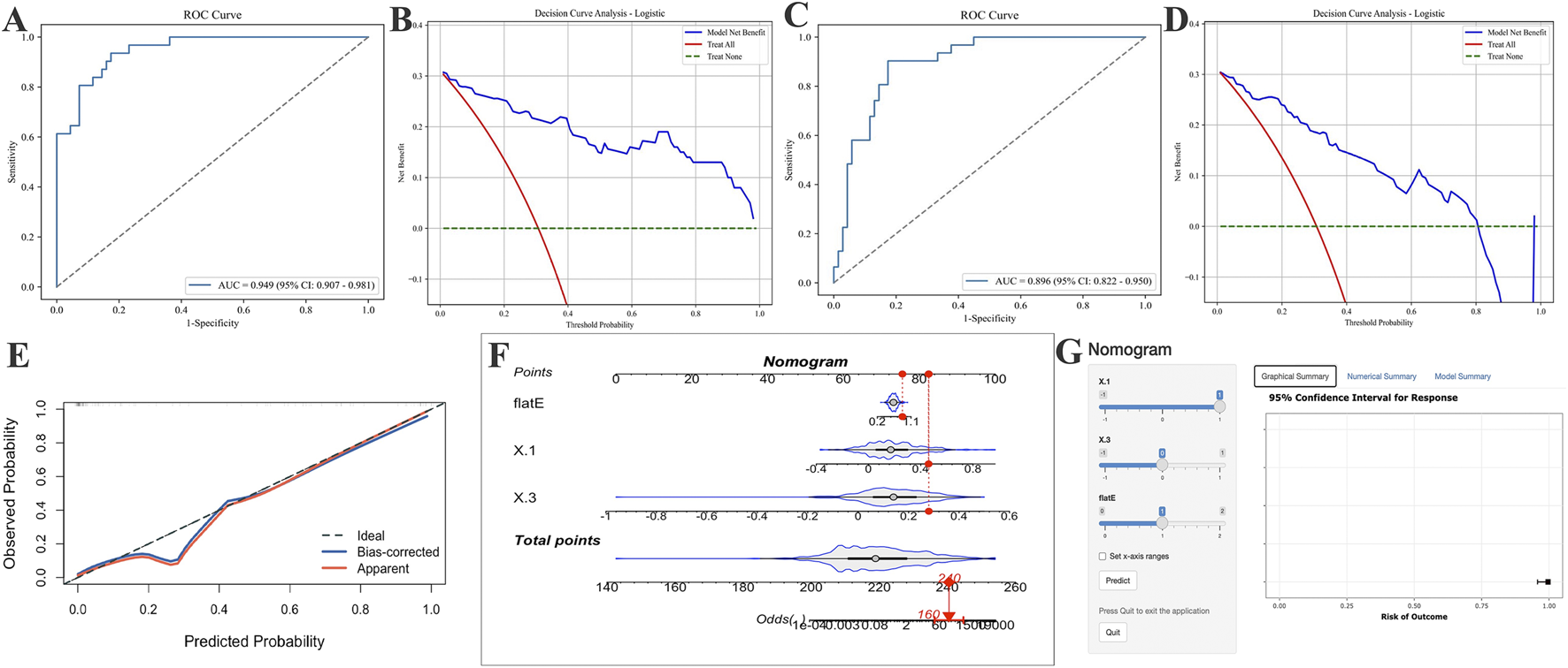 Application of AUC curves and DCA curves after incorporating different parameters into logistic regression models and establishing optimal logistic regression models for risk prediction. (A,B) Include only the AUC and DCA curves of the logistic regression model incorporating the change values from Δ1, Δ3 and the flat E. (C,D) Include only the AUC and DCA curves of the logistic regression model incorporating Δ1, Δ2, and flat E. (E) The final logistic regression model incorporating Δ1, Δ3, and flat E produced the calibration curve on the validation set. (F,G) Risk prediction nomogram (F) and risk calculator (G) for AL control efficacy after 5 years of OK-Lens wear in optimal model construction.