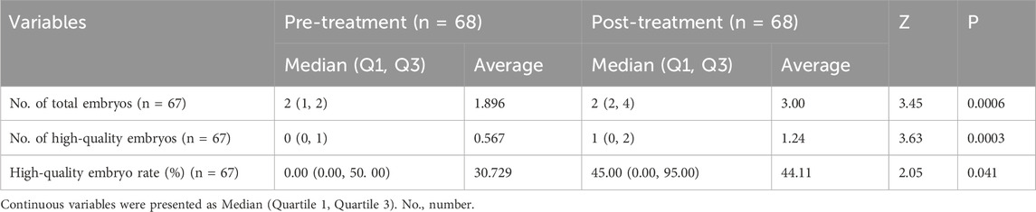 Statistical analyses were performed using the SPSS version 29.0 (SPSS, Inc., Chicago, IL, United States) and R language. The study analyzed the baseline demographic characteristics and compared the clinical parameters and reproductive outcomes between two consecutive IVF/ICSI cycles among the 68 enrolled patients. The statistical tests confirmed that the data in this study were predominantly non-normally distributed. For quantitative indicators of therapeutic effects (including FSH, AMH, and E2 levels; number of oocytes retrieved, 2PN zygotes, total usable embryos, high-quality embryos, and high-quality embryo rate), the Wilcoxon signed-rank test (paired non-parametric test) was used, with results expressed as median (M) and interquartile range (IQR, 25th–75th percentiles). For categorical indicators (including biochemical pregnancy rate, clinical pregnancy rate, embryo implantation rate, and live birth rate), comparisons were made using the Chi-square test, with data presented as numbers and percentages. The significant P value was set at <0.05.