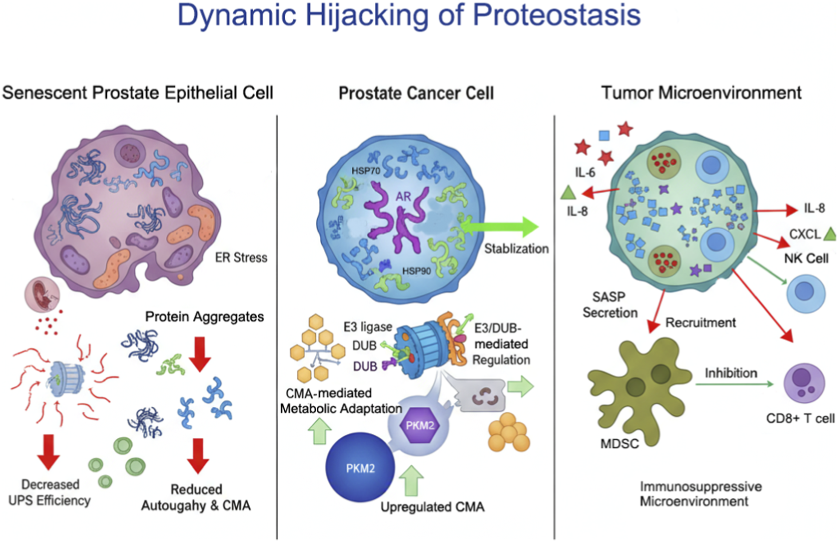 In prostate cancer, disruption of the proteostasis network—comprising molecular chaperones, the ubiquitin-proteasome system (UPS), and autophagy pathways—cooperatively converges on the androgen receptor (AR) as a central hub, driving tumor initiation, progression, and therapeutic resistance (Kim et al., 2013; López-Otín et al., 2013; Takayama and Inoue, 2013). This dysregulation extends beyond intracellular homeostasis to influence the tissue microenvironment, remodeling tumor ecology through the senescence-associated secretory phenotype (SASP), thereby promoting immunosuppression and malignant evolution (Melia et al., 2022; Krtolica et al., 2001; Acosta et al., 2008). This section integrates interactions among these three systems and explores how intracellular mechanisms impact microenvironmental dynamics.