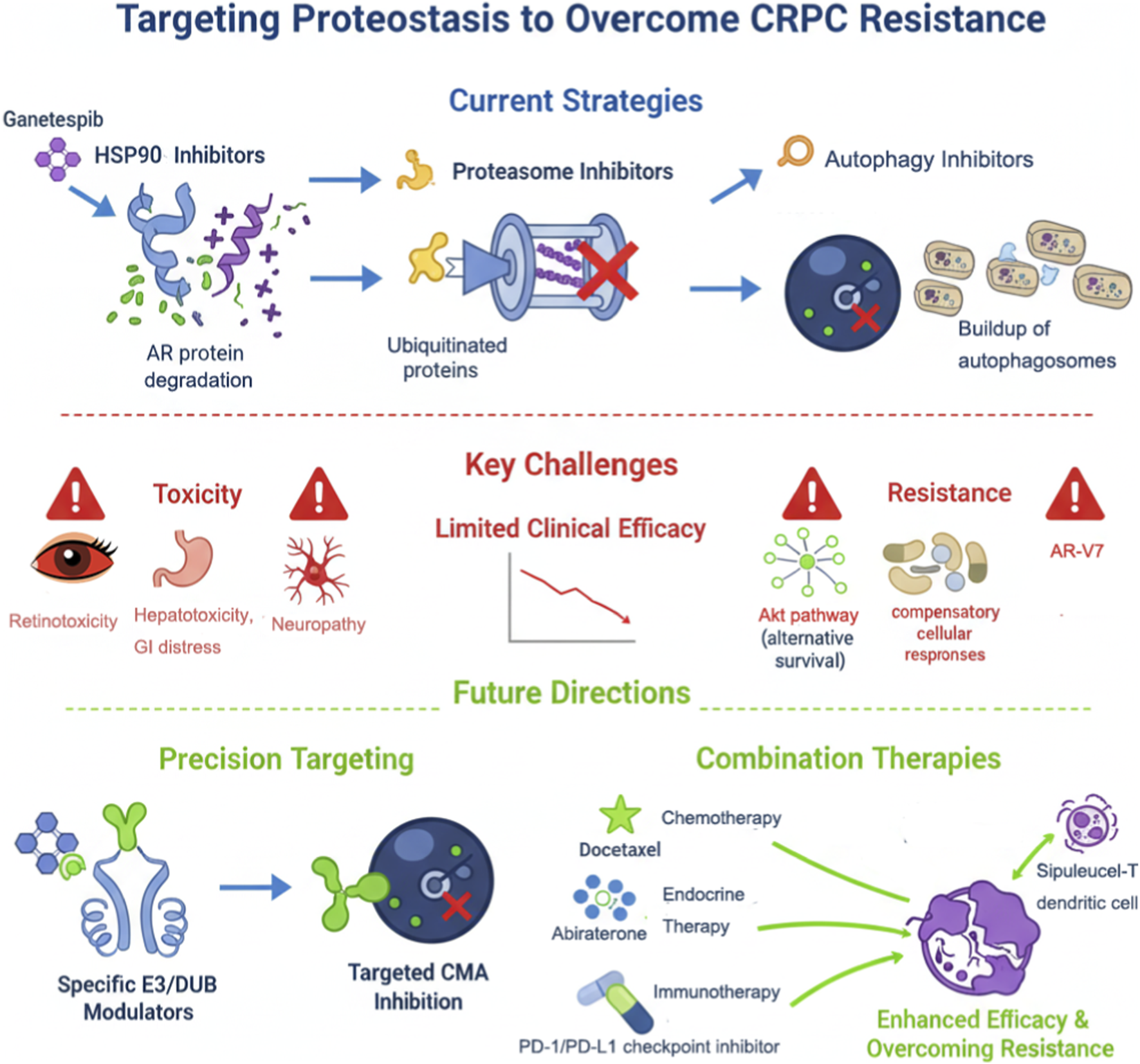 Future treatments should prioritize the development of highly selective agents (e.g., isoform-specific HSP90 inhibitors or E3/DUB modulators), optimize combination regimens to reduce toxicity, and employ biomarkers (e.g., AR-V7 expression, E3/DUB levels, or microenvironment features) to guide personalized therapy (Andersen et al., 2010; Domingo-Domenech et al., 2005; Grasso et al., 2012). Exploration of novel targets such as the CMA pathway and integration with immunotherapy holds promise to overcome current CRPC treatment barriers and achieve substantial survival benefits. Current limitations and future precision-targeting strategies for proteostasis in CRPC are summarized in Figure 2.
