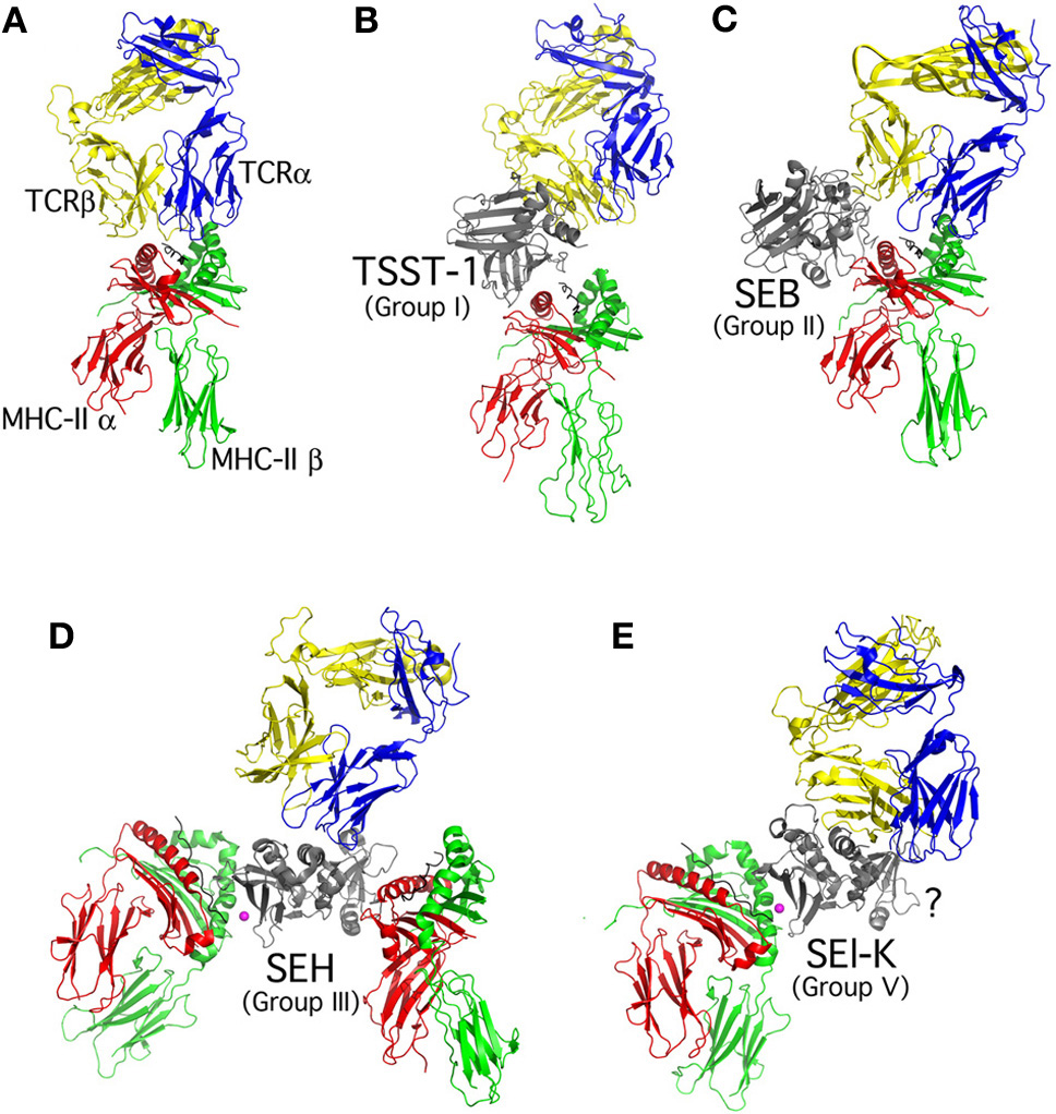 Structural overview of the SAg-mediated T cell activation complexes. Ribbon diagram models show (A) conventional T cell activation (Hennecke et al., 2000), and SAg-mediated T cell activation complexes for (B) Group I (e.g., TSST-1) (C) Group II (e.g., SEB) (D) Group III (e.g., SEH) and (E) Group V (e.g., SEl-K). Colors for TCR and MHC class II chains are labeled in Panel (A). The SAg activation complex models were generated by superposition of the TSST-Vβ (Moza et al., 2007) and TSST-MHC class II (Kim et al., 1994) structures, the SEC-Vβ (Fields et al., 1996) and SEB-MHC class II (Jardetzky et al., 1994) structures, the SEH-VαVβ (Saline et al., 2010), SEH-MHC class II β-chain (Petersson et al., 2001), and the SEA-MHC class II α-chain (Petersson et al., 2002) structures, and the SEK-Vβ (Gunther et al., 2007) and SEI-MHC II (Fernandez et al., 2006) structures. The TCR α-chain was modeled for clarity in each case from the conventional complex (Hennecke et al., 2000). The “?” in Panel (E) indicates that there is no current information regarding the presence, or absence, of the generic low-affinity MHC class II binding domain for Group V SAgs.