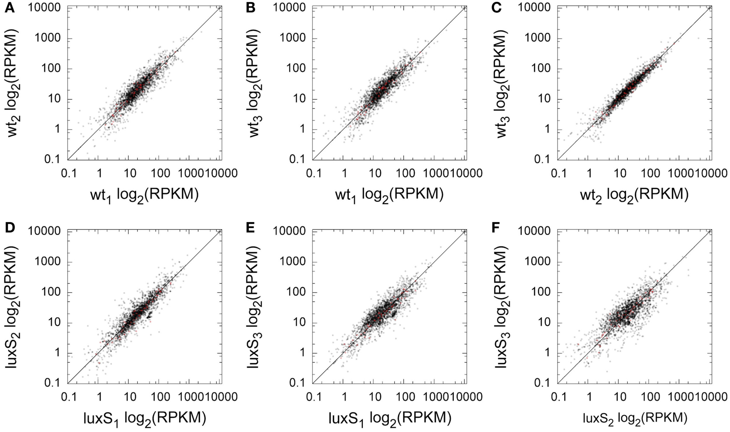 Replicate comparison of per-locus RPKM for coding sequences. For a pair of replicates, each locus has one point with the log2 RPKM in one replicate plotted against the log2 RPKM of a second. The diagonal line shows identity. (A) WT1 vs. WT2, (B) WT1 vs. WT3, (C) WT2 vs. WT3, (D) ΔluxS1 vs. ΔluxS2, (E) ΔluxS 1 vs. ΔluxS 3, (F) ΔluxS2 vs. ΔluxS3. Red colored data points indicate ORFs that demonstrated statistically significant relative abundance differences between WT and ΔluxS.