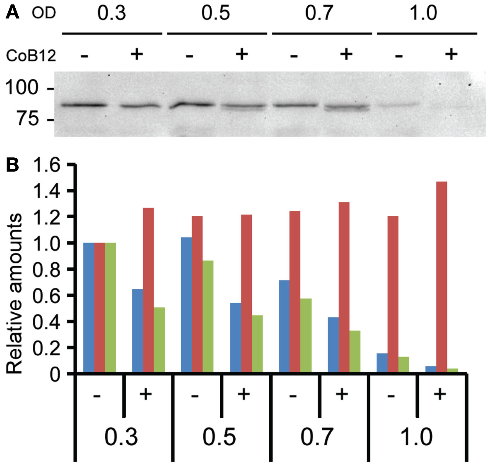 BtuB regulation by the cbl-1 riboswitch. (A) Western blot of lysates of P. gingivalis expressing BtuB::FLAGx3 protein, probed with anti-FLAG antibody. OD: optical density at 600 nm; CoB12: culture with 100 μM Coenzyme B12. Molecular mass markers are shown in kDa. (B) Ratio (green bars) of BtuB::FLAGx3 protein levels to Mfa loading control using Image lab software (Bio-Rad) from western blot results with anti-FLAG (blue bars) and anti-Mfa (red bars) antibodies. For normalization, protein levels at OD = 0.3 were taken as 1.0.