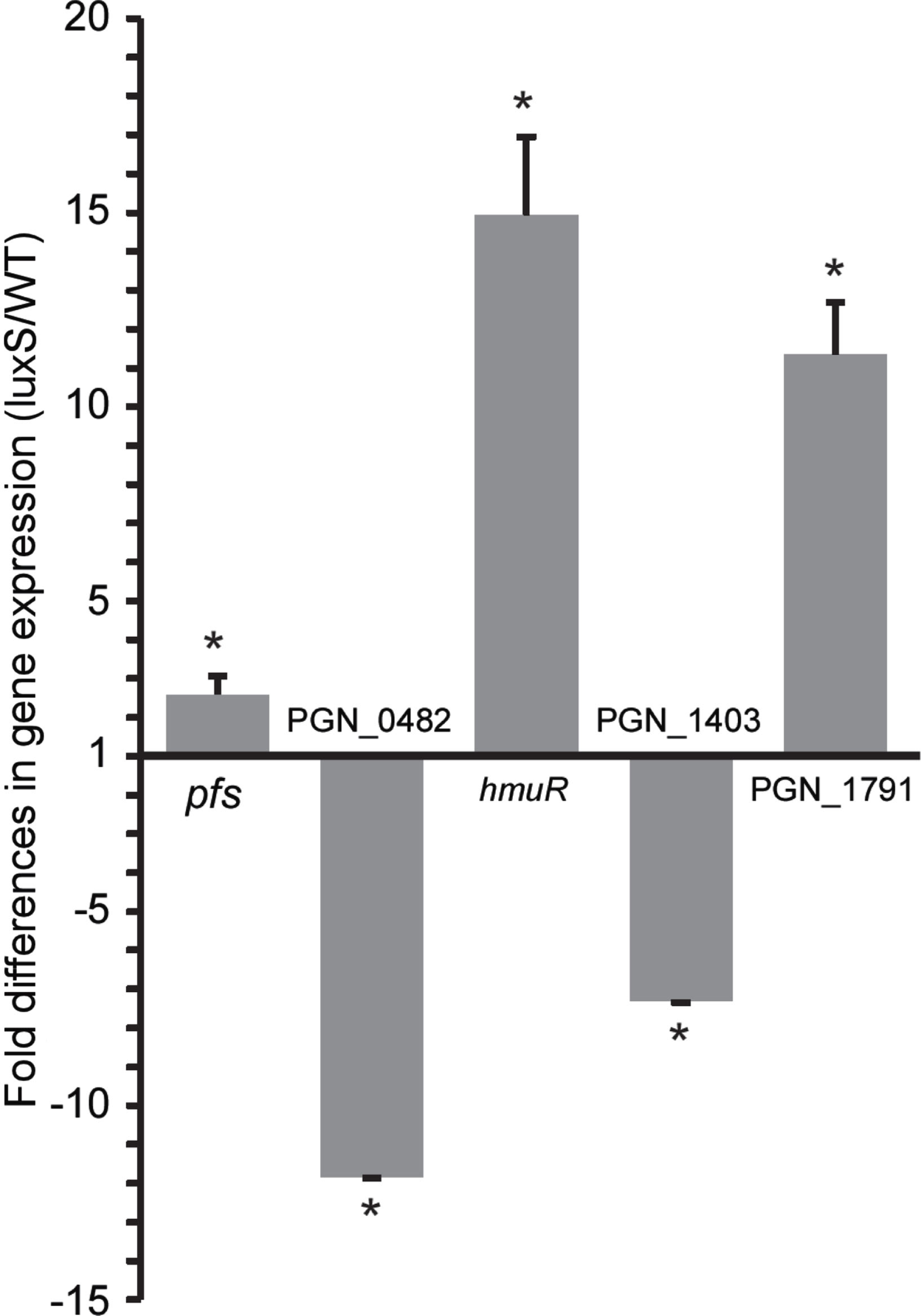 In the P. gingivalis chromosome, luxS (PGN_1474) is encoded on the negative strand, preceded and co-transcribed with pfs which encodes an enzyme that synthesizes the substrate for LuxS. mRNA for pfs was differentially abundant, over threefold higher in the mutant. This result suggests the existence of a regulatory feedback mechanism that senses the degree of production of AI-2 and acts to maintain optimal levels.