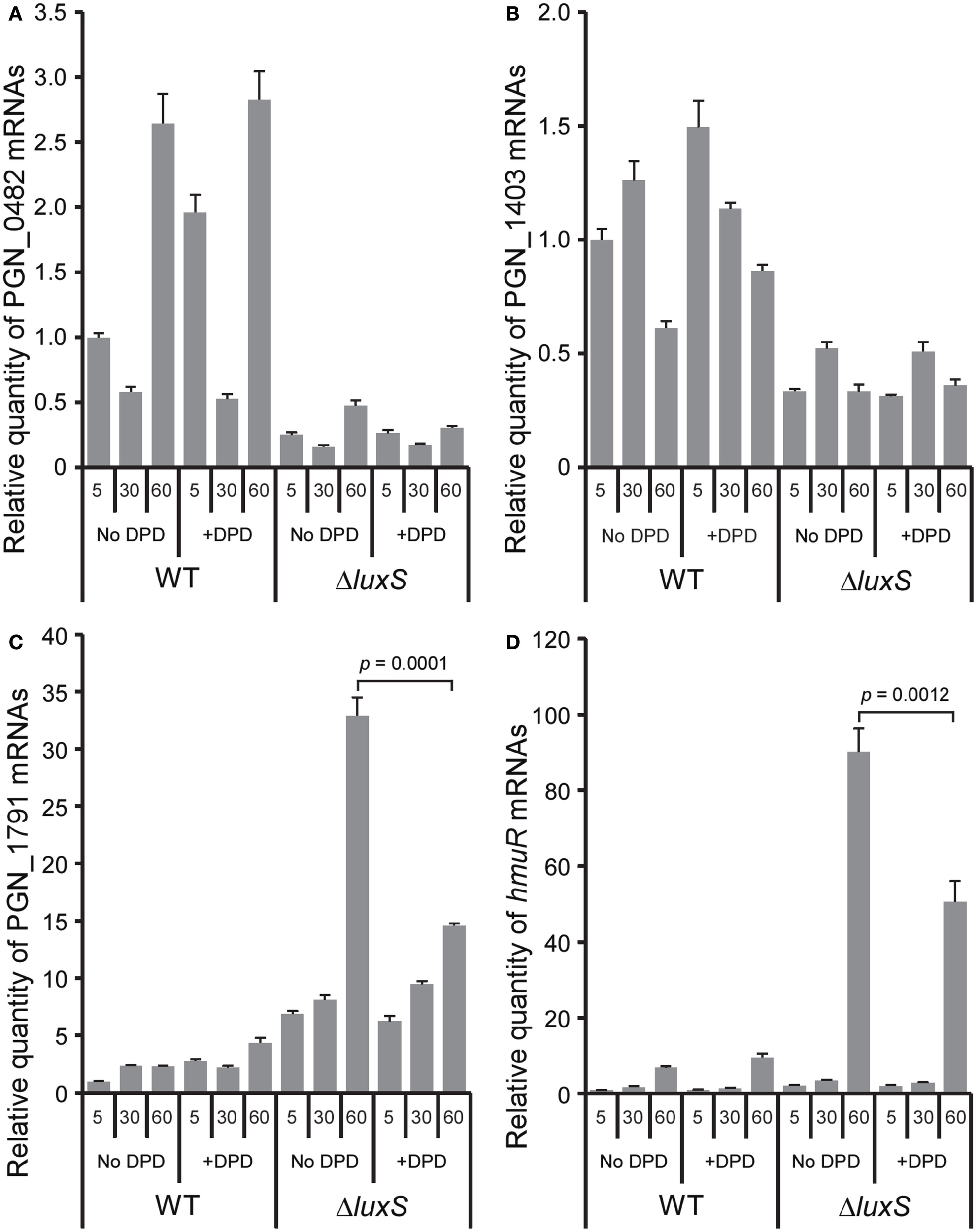 Exogenous DPD complementation of the ΔluxS phenotype. Levels of differentially expressed genes PGN_0482 (A), PGN_1403 (B), PGN_1791 (C), and hmuR(D), in the ΔluxS mutant strain were examined by qRT-PCR following incubation with 4 μM of synthetic DPD for the indicated times. Results are representative of three independent assays. p-values were calculated by unpaired t-test. Error bars represent standard deviations (n = 3).
