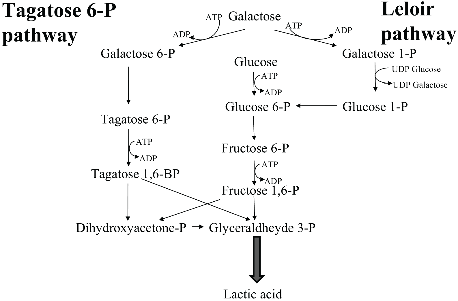 Homolactic fermentation. Homolactic fermentation always results from glycolysis. Obligate homofermentative LAB (pediococci, lactococci, streptococci, and some lactobacilli) produce 100% lactic acid through the Embden-Mayeroff route from different hexoses, which are internalized by means of specific membrane transporters such as permeases and symporters, and then isomerized to glucose or fructose. Galactose constitutes an exception since it can be either isomerized to glucose by the Leloir reaction mediated by high energy compounds (UDPGlu-UDPGal) or drifted to glycolysis through the D-tagatose 6-phosphate route, generating diidroxiacetonphosphate, hence glyceraldehyde phosphate (Figure 1).