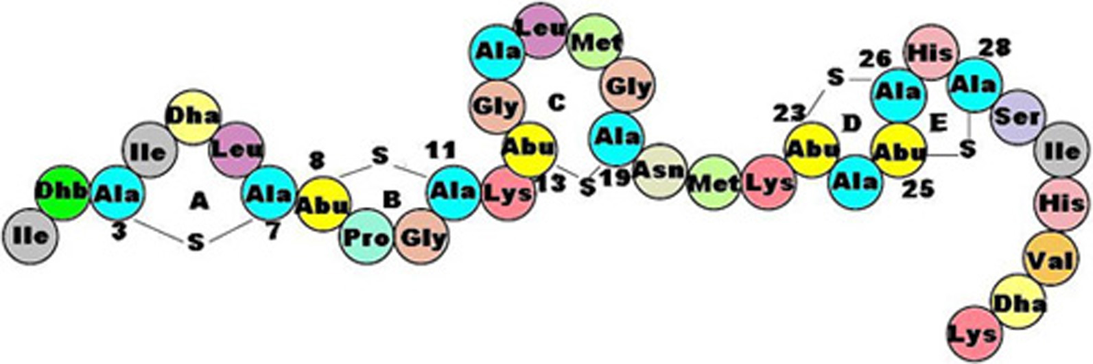 General structure of a lantibiotic: covalently bound alanines and post-translationally modified amino acids are peculiar features of these anti-microbial peptides.