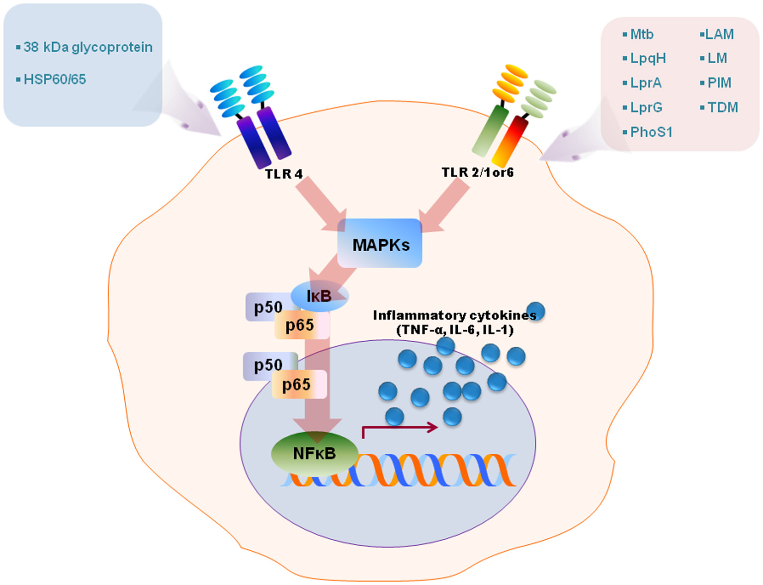 A schematic model for TLRs activation by diverse mycobacterial antigens. TLRs are involved in the innate recognition and responses in innate immune cells to numerous mycobacterial antigens. Some mycobacterial antigens including LpqH, lipoarabinomannan (LAM), lipomannan (LM), 38-kDa antigen, LprG, LprA, PhoS1, trehalose dimycolate (TDM), phosphatidylinositol mannoside (PIM) activate TLR2/1 or 6, whereas TLR4 recognizes heat shock protein (HSP) 60/65 and 38-kDa antigen. TLR activation by mycobacterial antigens leads an intracellular signaling pathway that culminates in the production of proinflammatory in macrophages and dendritic cells through MAPK and NF-κB pathways.