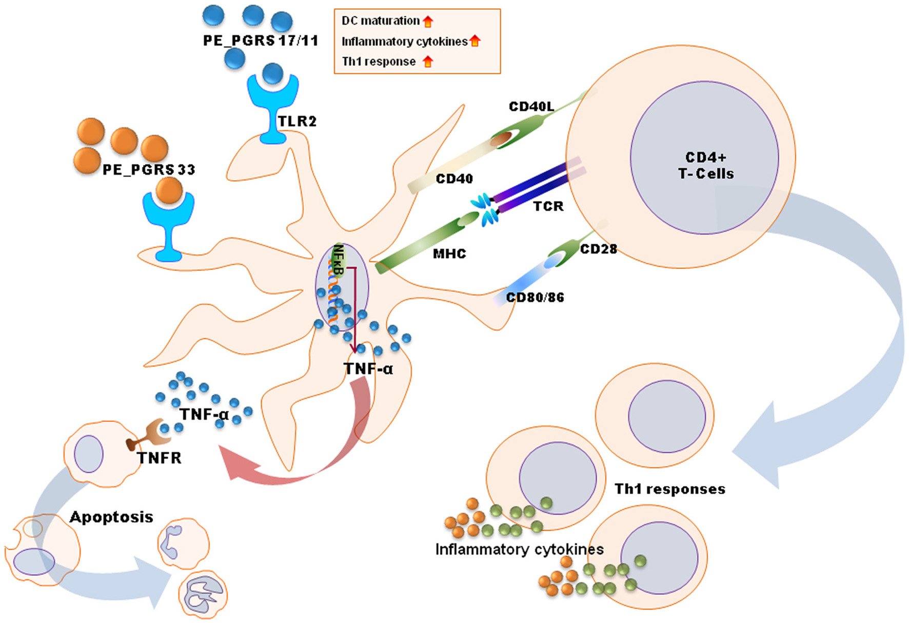 A schematic diagram for mechanisms of dendritic cell maturation/activation to stimulate T cells by mycobacterial antigens. PE_PGRS proteins activate dendritic cells through TLR2-MAPK-NF-κB signaling pathways. PE_PGRS 33-induced TNF-α by dendritic cells induces apoptosis in macrophages. Others (e.g., Rv0462, Rv0315, Rv0577, and PE_PGRS 17/11) increase expression of costimulatory molecules (CD80, CD86, and class II MHC) and proinflammatory cytokines (TNF-α, IL-1β, IL-6, and IL-12), leading to Th1 immune responses.