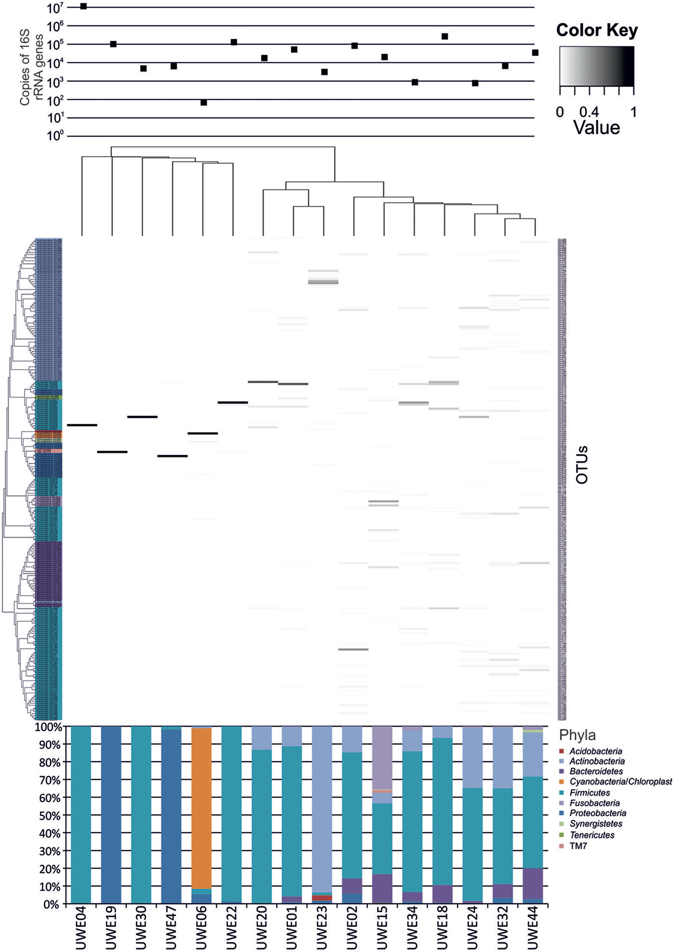 Heatmap showing the relative abundance of the OTUs per sample. The top panel presents the qPCR values for each sample while the bottom panel shows the percentage distribution of the OTUs' phyla for each sample.