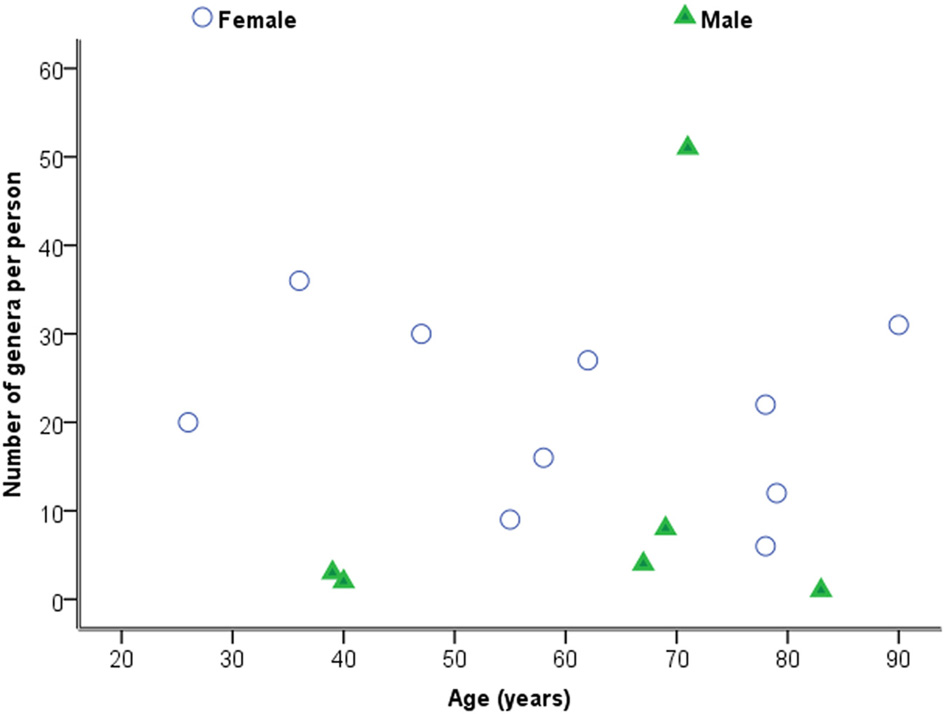 Considering samples individually in the first instance, Figure 2 is a plot of the total number of genera identified per person against age. Statistical analysis using Spearman's correlation coefficient indicates that the number of genera and age are not significantly correlated in the sample (r = −0.029, p = 0.914, two-sided).