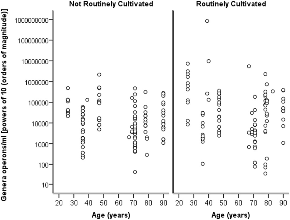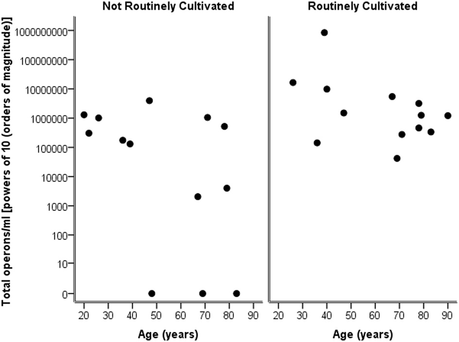 Considering the number of operons/ml as determined by qPCR for both routinely cultivated and not routinely cultivated individually, it can be seen in Figure 3 that the “total” number of bacteria is similar across the age for both groups. Note “not routinely cultivated” also includes those not reported individually by standard methods; please see Tables A3, A4 for more details on groupings. Further analysis using Spearman's rank correlation coefficient indicates that the sample relationship between operons/ml and age does not achieve statistical significance for genera not routinely cultivated (r = −0.464, p = 0.110, two-sided) or for routinely cultivated genera (r = −0.391, p = 0.187, two-sided).