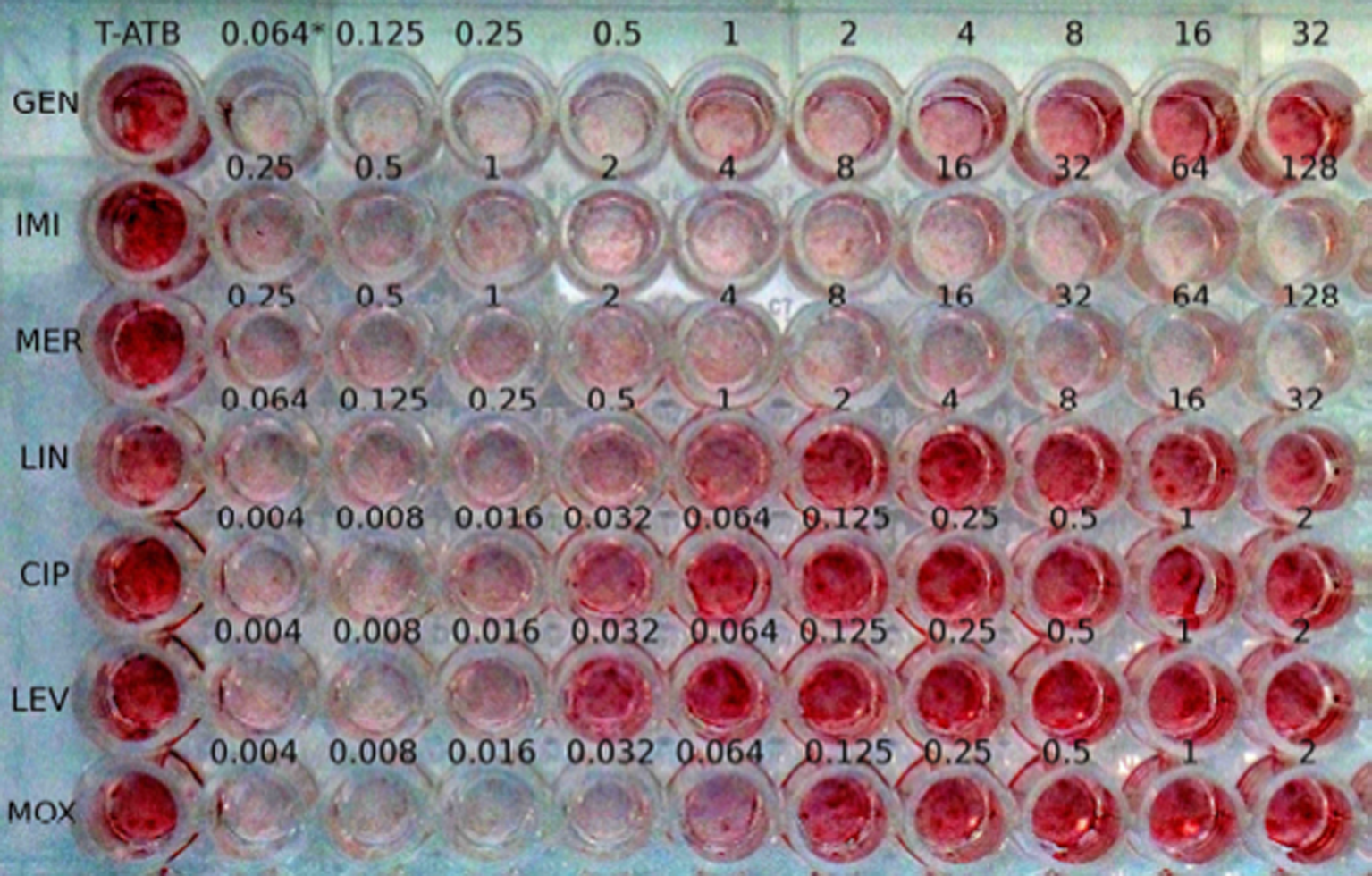 Image of a dye uptake assay for the Ft24 strain. *, antibiotic concentrations in the well (μg/mL); T-ATB, uninfected MRC-5 monolayer incubated with the highest concentration of the antibiotic tested; GEN, gentamicin; IMI, imipenem; MER, meropenem; LIN, linezolid; CIP, ciprofloxacin; LEV, levofloxacin; MOX, moxifloxacin.