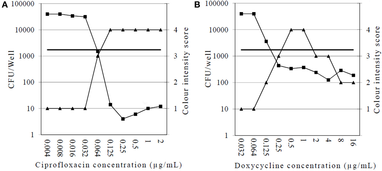 Comparison of results obtained with the CFU enumeration and dye uptake assays for intracellular activity of ciprofloxacin (A) and doxycycline (B) against F. tularensis subsp. holarctica stain Ft6. Squares, CFU counts 24 h post-infection (CFU/well); triangles, dye uptake assay (score 1–4); horizontal line, 1 h post-infection intracellular bacterial load (CFU/well) as determined by the CFU-enumeration method (results of one experiment).