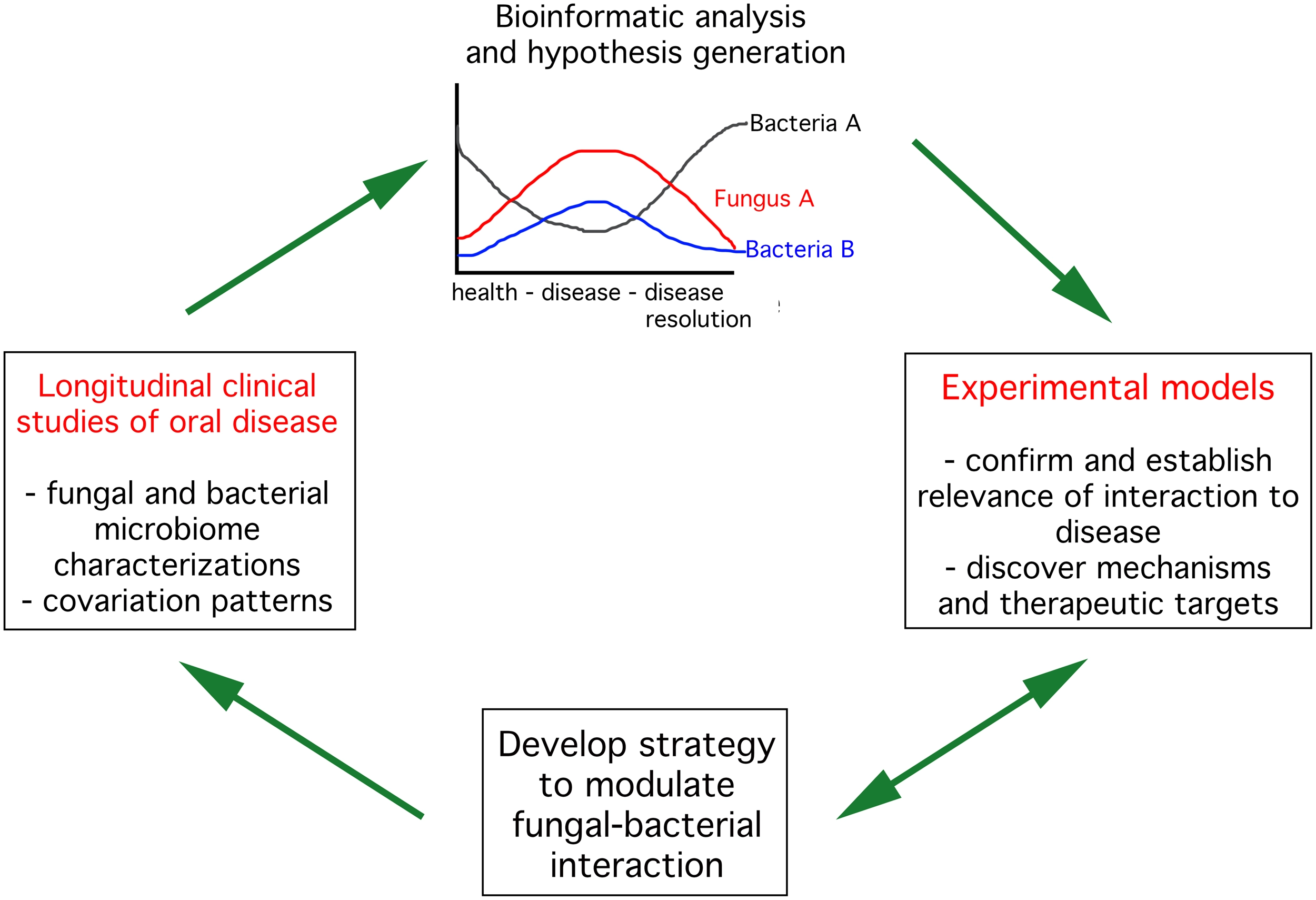 Strategies to advance knowledge on fungal bacterial interactions in the context of oral health. The first step (left panel) is to conduct longitudinal clinical studies in humans characterizing the fungal and bacterial components of the microbiome throughout progression and resolution of oral diseases. These observational studies should lead to identification of potential positive (top panel, fungus A and bacteria B) or negative (top panel, fungus A and bacteria A) interactions between bacteria and fungi. Selected interactions need to be tested in disease-relevant experimental models to confirm their importance to disease progression and dissect mechanisms mediating the interaction. These studies could then be used to develop strategies to interfere with fungal-bacterial interactions. Such strategies need to be tested in experimental model systems and eventually in humans.