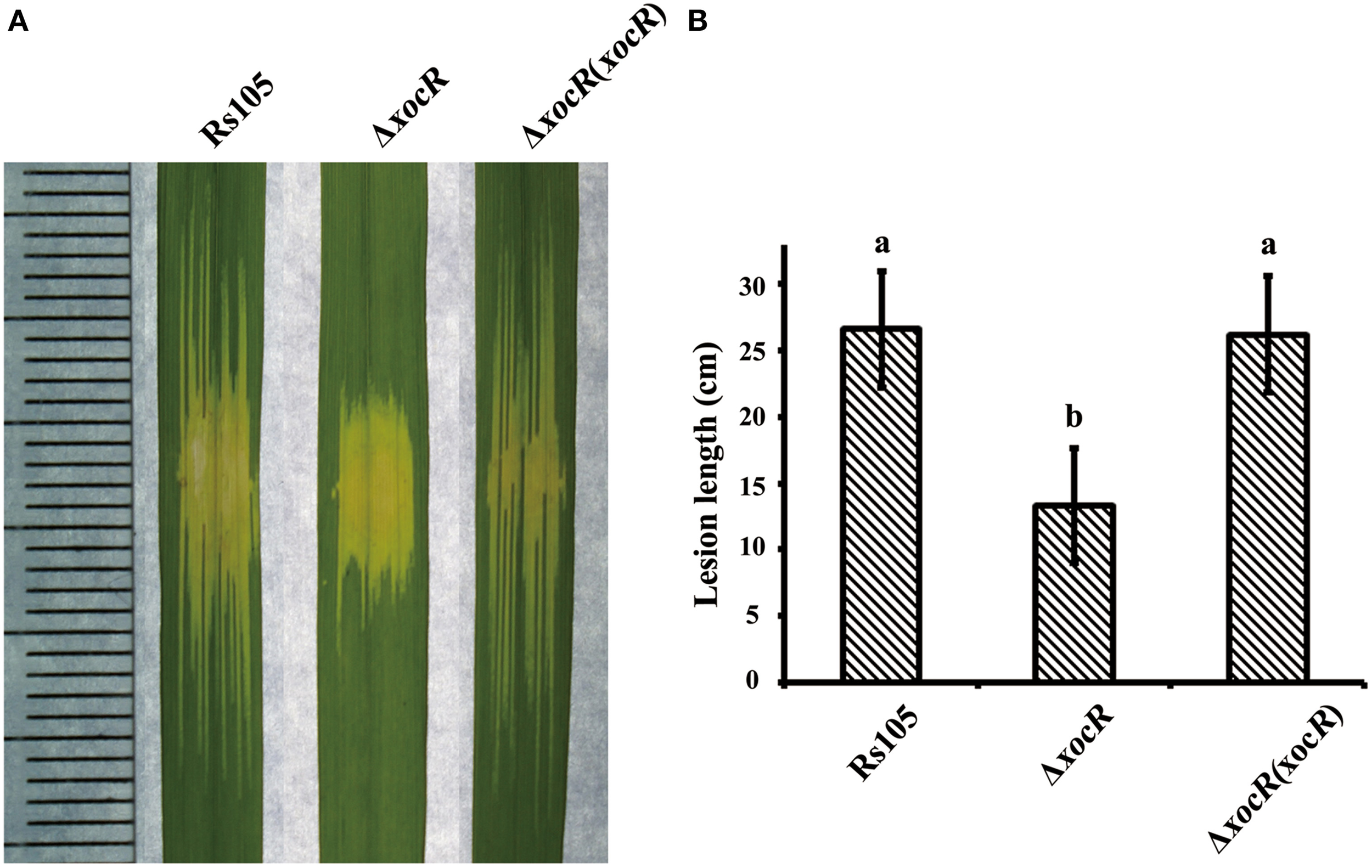 Mutation of xocR impaired the virulence of Xanthomonas oryzae pv. oryzicola. (A) Representative result of water-soaking lesion lengths on the rice seedling leaves (cv. Shanyou63, 2-week old) by infiltration with wild-type Rs105 and the xocR mutant. (B) Calculated data of water-soaking lesion lengths on the leaves of rice seedling leaves. Rs105, wild-type strain; ΔxocR, the xocR deletion mutant; ΔxocR (xocR), the complemented strain of the xocR deletion mutant. Three replicates were used for each treatment, and the experiment was performed three times. Vertical bars represent standard errors. Different letters above data bars indicate a significant difference between the wild-type strain and tested mutants (P < 0.05; t-test).