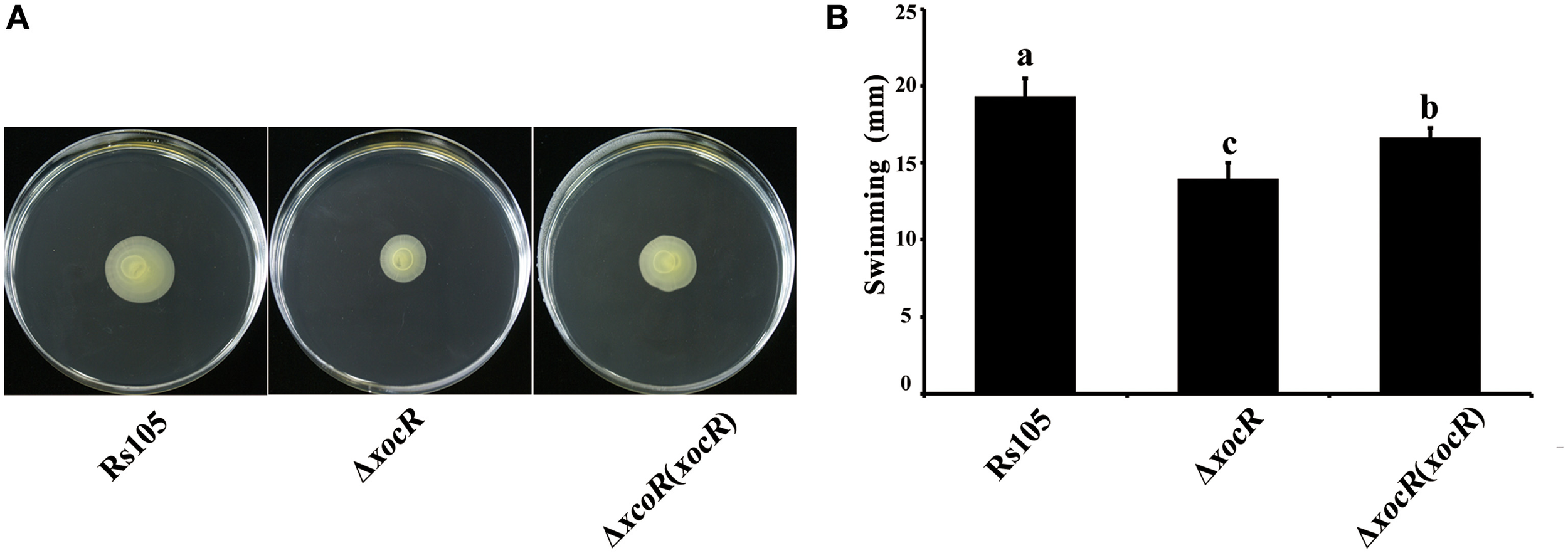 Mutation of xocR impaired cell swimming motility of Xanthomonas oryzae pv. oryzicola in the presence of rice macerate. (A) Representative result of motility haloes of wild-type Rs105 and the xocR deletion mutant; (B) Calculated data of diameters of the swimming haloes on the plate of NA with rice macerate by tested Xoc strains. Rs105, wild-type strain of X. oryzae pv. oryzicola; ΔxocR, xocR-deletion mutant of X. oryzae pv. oryzicola; ΔxocR (xocR), the complemented strain of the xocR deletion mutant. Three replicates were used for each treatment, and the experiment was performed three times. Vertical bars represent standard errors. Different letters above data bars indicate a significant difference between the wild-type strain and tested mutants (P < 0.05; t-test).