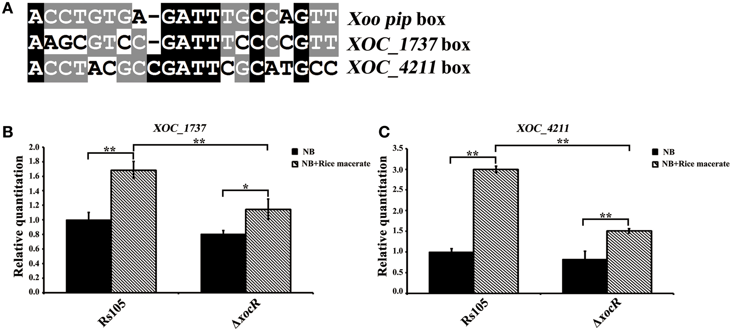 The contribution of rice macerate to the regulation of xocR on the transcription of two known virulence-associated genesn Xanthomonas oryzae pv. oryzicola. (A) Sequence alignment of the characterized Xoo pip box and the promoter regions of two characterized virulence-associated genes (XOC_4211 and XOC_1737) in Xoc. (B,C) Determination of the transcriptional level of XOC_1737 and XOC_4211 between wild-type Rs105 and the xocR deletion mutant (ΔxocR), respectively in the absence or presence of rice macerate. XOC_1737 encodes a DNA repair protein (RecN) and XOC_4211 encodes an anthranilate synthase component I (TrpE). Three replicates were used for each treatment, and the experiment was performed three times. Vertical bars represent standard errors. The data was analyzed by One-Way ANOVA. Tukey HSD post-hoc comparisons were reported, where **P < 0.001, *P < 0.005.