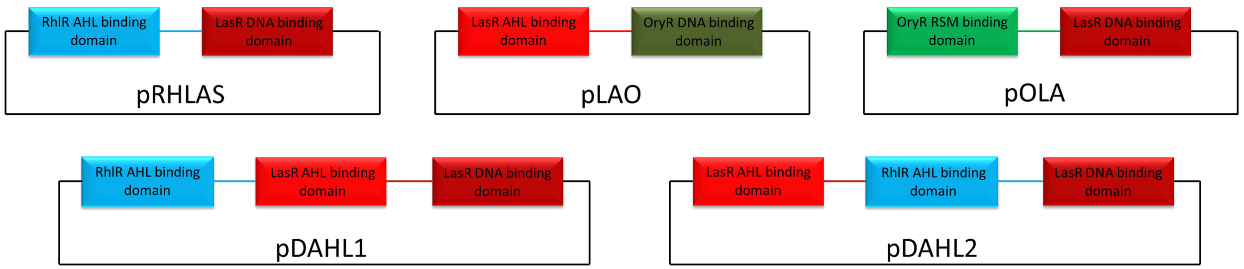 Gene synthesis was performed by GeneArt® (Life Technologies, Italy) or by GenScript (GenScript, USA) and all nucleotide sequences are listed in Table S3. Construction of pLAO and pOLA was performed in a sequential subcloning where first the synthesized gene from pMX was cloned in pBBR1MCS2 using HindIII/SacI and then transferred to pBBR1MCS3 using XhoI/SacI. For the construction of pDAHL1 the synthesized gene was transferred from cloning vector pMX to pBBR1MCS2 using HindIII/SacI, resulting in the expression vector pDAHL1. To generate pDAHL2 the synthesized gene was transferred from pUC57 to pBBR1MCS2 using HindIII/SacI, resulting in the creation of pDAHL2. For the generation of pRHLAS amplifications and sequential cuts were performed as follows. First lasR and rhlR were amplified from P. aeruginosa PUPa3 using the pair of primers LasR Fw/LasR Rv and RhlR Fw/RhlR Rv to generate pLASR and pRHLR, respectively. Amplicons were cloned into pGEM® T Easy and sequenced. Constructs were then transferred to pBBR1MCS2 using HindIII/SacI. From this point pLASR was digested using HindIII/BsrBI/SacI generating two fragments which were the AHL-binding domain (approximately 480 bp) and the DNA-binding domain (approximately 230 bp) and the latter eluted and saved. The construct pRHLR was used as template to amplify the AHL-binding domain using the pair of primers T3/RhlRSmaI Rv and the amplicon was cloned in pGEM® T easy. It was then digested with HindIII/SmaI generating a fragment of approximately 520 bp. The AHL-binding domain of RhlR was then cloned HindIII/SacI in frame with the DNA-binding domain of LasR in pBBR1MCS2 generating the construct pRHLAS. All hybrid constructs are schematically represented in Figure 1.