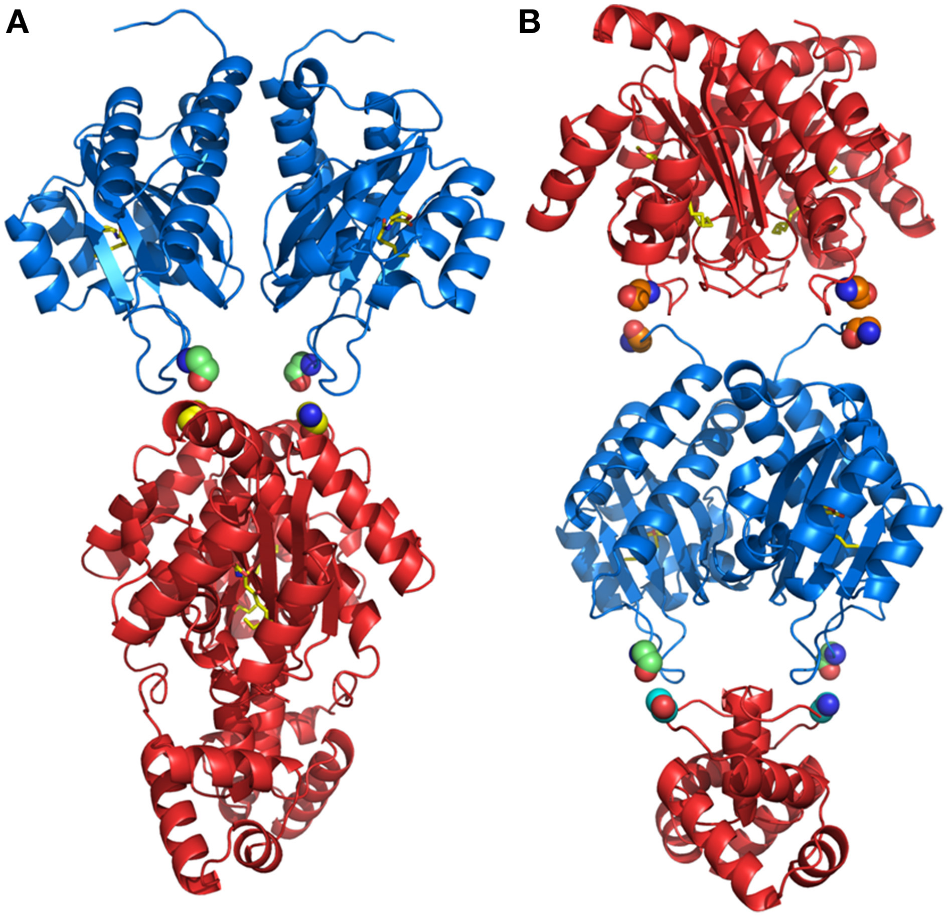 Comparison of the dimeric assembly of the 3D structure-based homology models of the synthetic hybrids containing two AHL-binding domains. (A) Dahl1 and (B) Dahl2. The color code is as in Figure 1. The corresponding linking flexible regions in the Dahl1 and Dahl2 hybrids variants are colored in green/yellow and in orange and in green/cyan, respectively. The main chain atoms of the residues that are joined together in the synthetic hybrids are shown as spheres. The carbon, nitrogen, and oxygen atoms of AHLs, are colored in yellow, blue, and red, respectively. Figures produced by Pymol (DeLano, 2002).