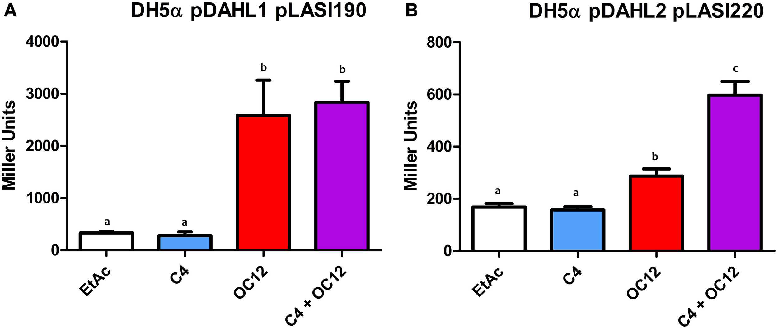 β-galactosidase assays showing reported expression levels regulated by the lasI promoter in different conditions. (A) β-galactosidase measurement of the promoter activity in the presence of the hybrid protein Dahl1 (pDAHL1) with reporter plasmid pLASI190 in the absence (EtAc) or in the presence of AHLs (C4 and/or OC12-HSL) at a concentration of 1 μM. (B) β-galactosidase measurement of the promoter activity in the presence of the hybrid protein Dahl2 (pDAHL2) with reporter plasmid pLASI220 in the absence or presence of AHLs (C4 and/or OC12-HSL) at the concentration of 1 μM. All experiments were performed on triplicate, the mean, and error are shown and the statistical analysis were calculated using Student's t-test (P ≤ 0.05). Distinct letters (a and b) indicate statistically different values.