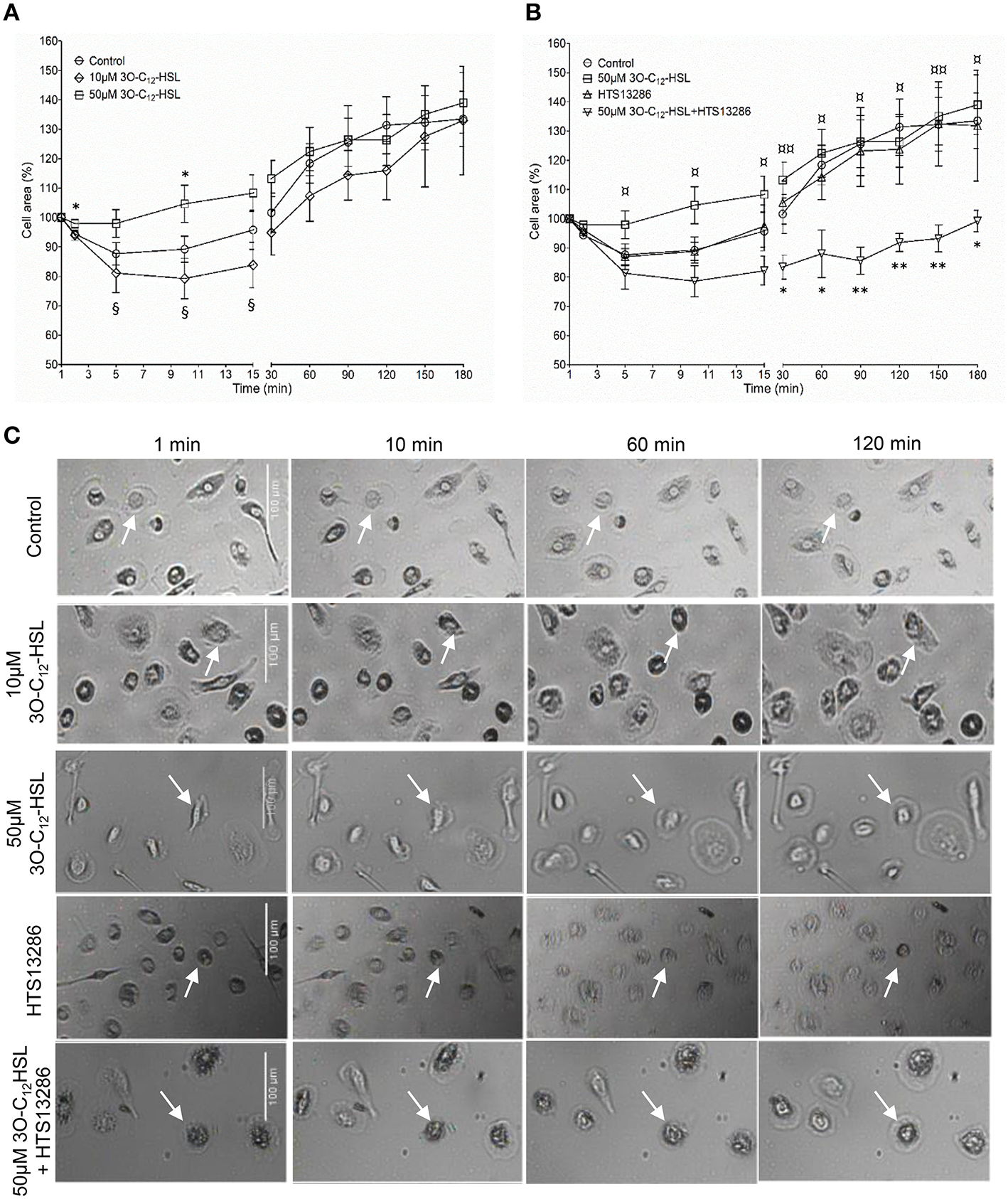Live 2D imaging of cell area and protrusive activity in 3O-C12-HSL-stimulated macrophages. (A) Macrophages were treated either with 0.02% DMSO (Control), or 10 and 50 μM 3O-C12-HSL. (B) Cells were treated with 50 μM 3O-C12-HSL, 25 μM HTS13286, or simultaneously with both 50 μM 3O-C12-HSL and 25 μM HTS13286, or 0.27% DMSO (not shown) or 0.02% DMSO as a vehicle control (Control). Control groups and 50 μM 3O-C12-HSL groups were the same in (A) and (B). A time-lapse Videos S1–S5 were recorded using JULI and cell area was quantified and shown as percent (%) change relative to the initial area. Values are the mean ± SE (n = 8 for Control and 50 μM 3O-C12-HSL; n = 3 for 10 μM 3O-C12-HSL; n = 4 for 25 μM HTS13286; and 50 μM 3O-C12-HSL+25 μM HTS13286) based on at least 20 cells for each condition and experiment. Significant differences were analyzed by one-tailed, un-paired Student's t-test and are indicated with * or ** when P < 0.05 or P < 0.01 compared to control, with ¤or ¤¤when P < 0.05 or P < 0.01 comparing 50 μM 3O-C12-HSL and 50 μM 3O-C12-HSL+HTS13286, and with § when P < 0.05 comparing 10 and 50 μM 3O-C12-HSL. (C) Representative images from typical time-lapse Videos S1–S5 recorded with 2D imaging. White arrows point on macrophages with typical outcomes for cell areas. Bar 100 μm.