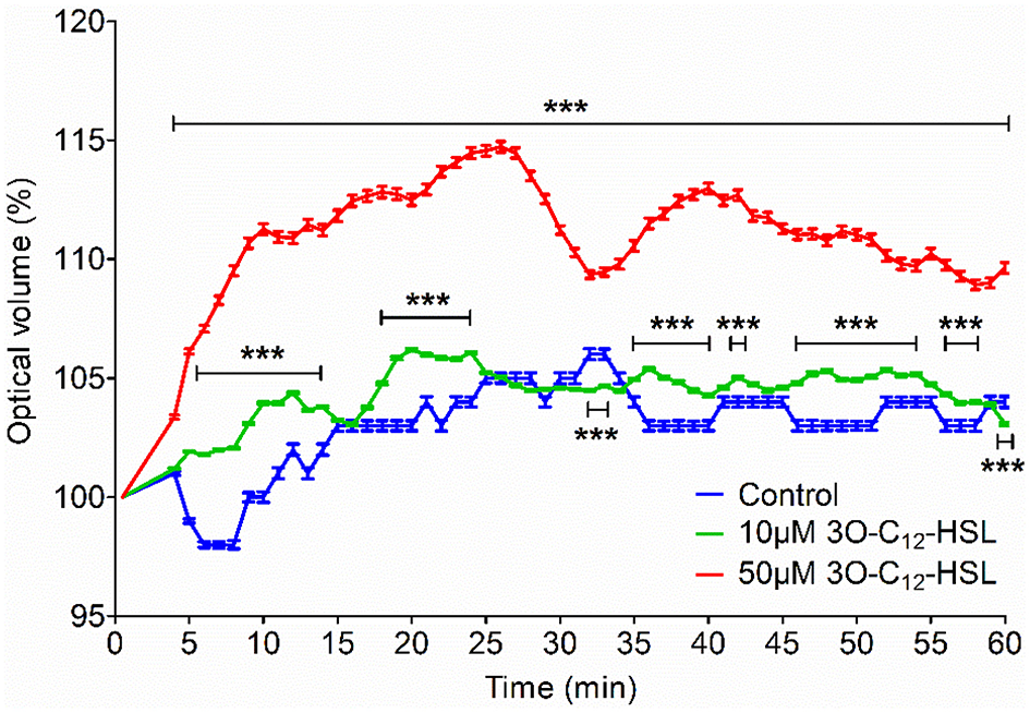 Since 3O-C12-HSL-treatment caused increased cell area in the macrophages, parallel changes in cell volume driven by water transport might occur. To test this, we used live 3D holographic imaging and subsequent quantification of changes in the optical volume of macrophages over time (Figure 2). After treatment with 10 ÎĽM 3O-C12-HSL, we noticed a modest increase in the optical volume in macrophages compared to control cells; this was significant during several time periods, i.e., around 10, 20, 40, and 50 min. Treatment with 50 ÎĽM 3O-C12-HSL resulted in a more pronounced increase in the optical volume in the macrophages by 9.0%, compared to the control, with significance during the whole time course (Figure 2). Thus, 3D holographic, live-cell visualization data corroborated that P. aeruginosa 3O-C12-HSL enhanced the volume of macrophages, being consistent with our results on increased cell area and protrusive activity from 2D live imaging (Figure 1).