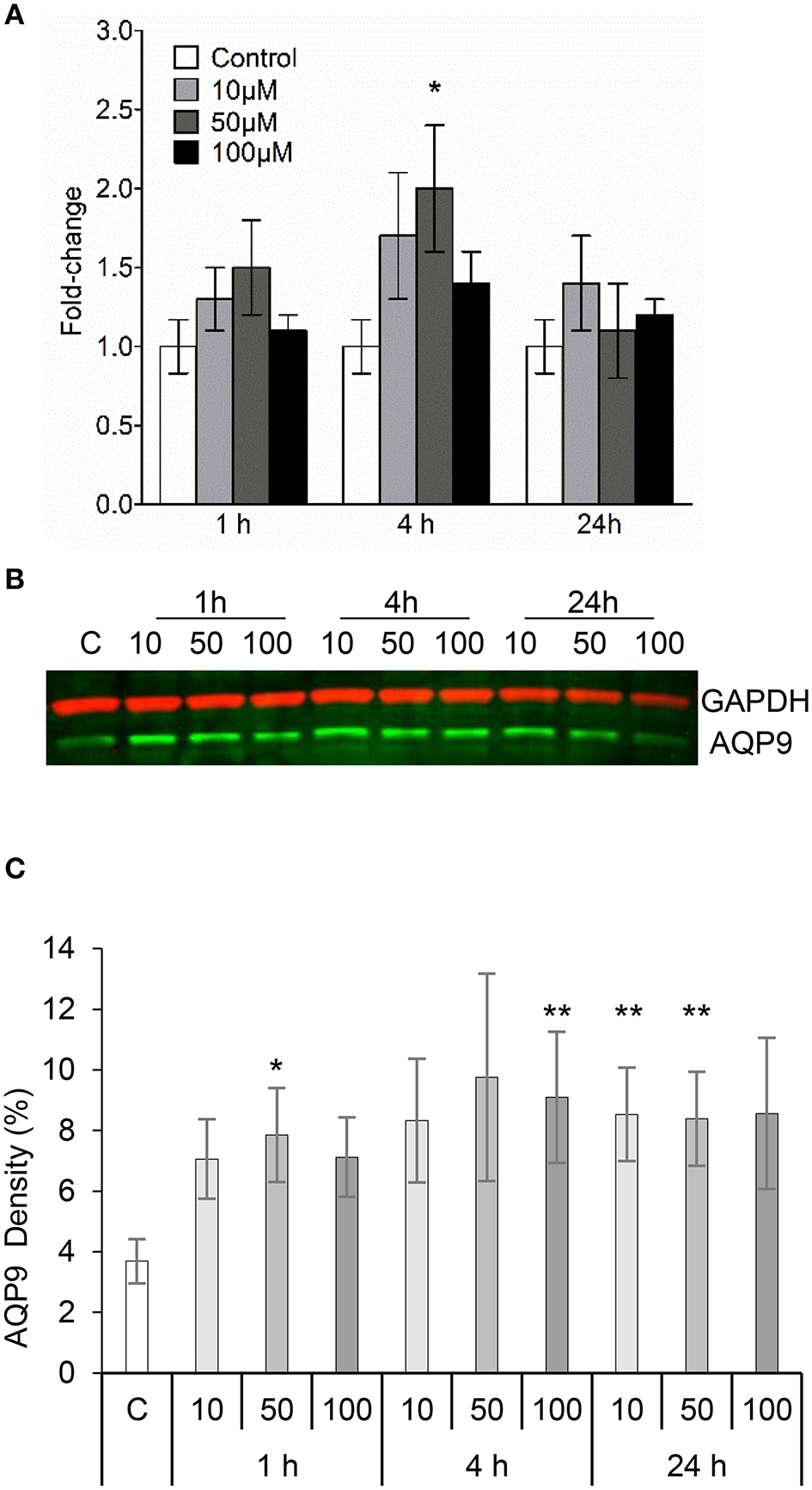 Human leukocyte adaptation to different environmental constraints requires changes in volume, presumably associated with water fluxes over the plasma membrane through the predominant AQP9 (Loitto et al., 2002; Karlsson et al., 2011, 2013). We have recently shown that infections with P. aeruginosa do increase the AQP9 expression in macrophages, and that bacteria with a fully functional QS-system provoke a larger increase compared to a mutant lacking 3O-C12-HSL and C4-HSL (Holm et al., 2015). Because macrophages changed their cell area and volume in response to 3O-C12-HSL, we decided to further investigate whether the expression of AQP9 at mRNA and protein levels were affected. This was analyzed by qPCR (Figure 3A) and immunoblotting (Figures 3B,C) for the expression of AQP9 with GAPDH as a control. In general, after treatment of macrophages with 10, 50, and 100 ÎĽM 3O-C12-HSL for 1, 4, and 24 h, the mRNA levels were elevated compared to the dilution control (Figure 3A). Moreover, 4 h-treatment with 50 ÎĽM 3O-C12-HSL caused a significantly increased and almost 2-fold greater AQP9 mRNA expression. Next, immunoblotting for AQP9 and GAPDH revealed generally higher levels of AQP9 in macrophages after 3O-C12-HSL-stimulation (Figures 3B,C). Furthermore, a significant increase in AQP9 expression level was detected in macrophages treated with i.e., 50 ÎĽM for 1 h, 100 ÎĽM for 4 h, 10 ÎĽM for 24 h, and 50 ÎĽM for 24 h. Taken together, this suggests that 3O-C12-HSL does increase the expression of AQP9 at both protein and mRNA levels in human macrophages.