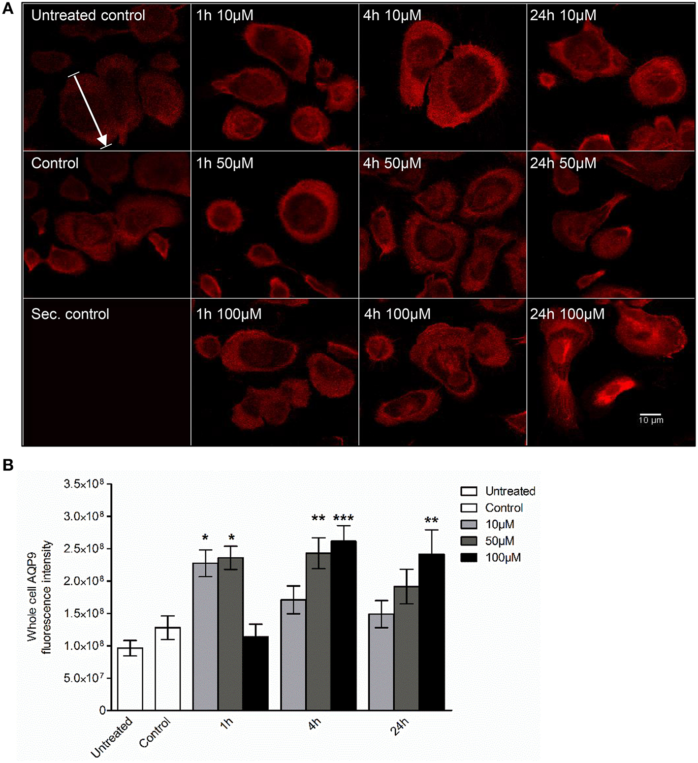 Visualization of AQP9 cellular distribution in 3O-C12-HSL-stimulated macrophages. (A) Macrophages were either untreated (Untreated control), or treated with diluent (Control), or stimulated with 10, 50, and 100 μM 3O-C12-HSL for 1, 4, or 24 h, stained for AQP9 (red) and analyzed by LSCM. Staining with secondary antibody (Sec. control) as a control. The data are from one of six independent experiments. Bar 10 μm. (B) Quantification of AQP9 immunofluorescence intensity measured as a total integrated intensity density of whole macrophage area. Columns represent the means ± SE. Significant differences are indicated with * when P < 0.05, ** when P < 0.01, and *** when P < 0.001, as analyzed by one-way ANOVA and Dunnett's multiple comparison test. Data from at least four different experiments performed on separate days from six different donors were used, and at least 100 cells in total per condition were analyzed.