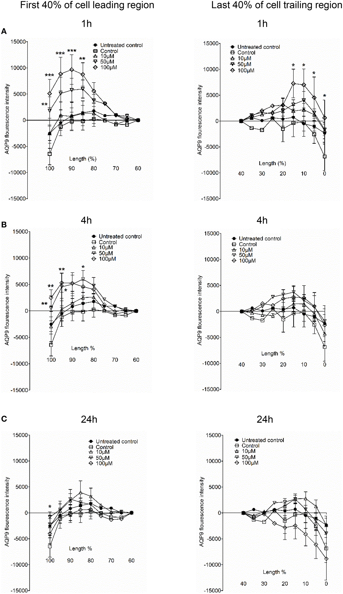 AQP9 intensity profiles across the leading and trailing regions in macrophages. The experiment, measurements and the quantifications of AQP9 intensity profiles over the cell in the direction of polarization were performed as shown by white arrow in Figure 4A. AQP9 intensity difference in the first 40% of cell leading region (left row) and last 40% of cell trailing region (right row) in macrophages after 3O-C12-HSL-treatments for 1, 4, and 24 h are shown in (A), (B), and (C), respectively. Values are the mean ± SE. Significant differences are indicated with * when P < 0.05, ** when P < 0.01, and *** when P < 0.001, as analyzed by one-way ANOVA. Data are from at least 4 different experiments performed on separate days from six different donors, and at least 100 cells in total per condition were analyzed.