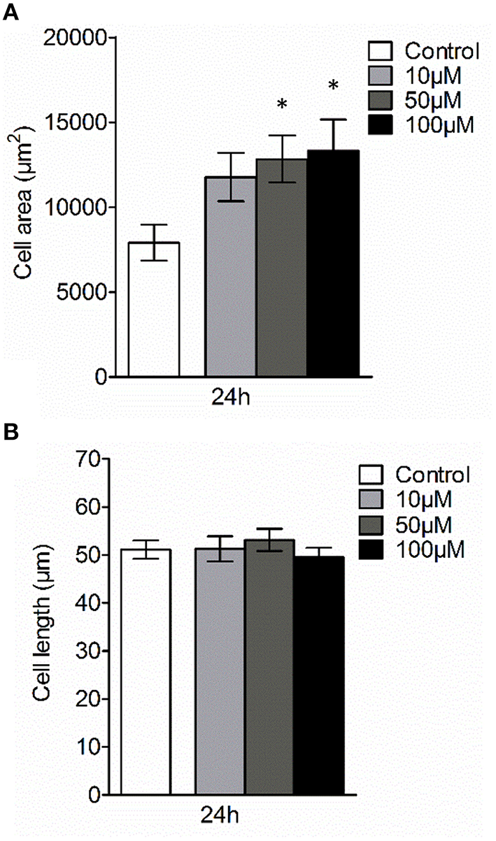 Effect of 3O-C12-HSL on AQP9-related cell size of macrophages. Cell were either treated with diluent 0.02% DMSO (Control) for 24 h, or stimulated with 10, 50, and 100 μM 3O-C12-HSL for 24 h, stained for AQP9, analyzed by LSCM as shown in Figure 4A. (A) Quantification of AQP9-related cell area. (B) Quantification of the approximate cell length of AQP9-stained macrophages (measured as indicated by white arrow in Figure 4A in the direction of polarization). Columns represent the means ± SE. Data from at least four different experiments performed on separate days from six different donors, and at least 100 cells in total per condition. Significant differences are indicated with * when P < 0.05, as analyzed by one-way ANOVA and Dunnett's multiple comparison test.