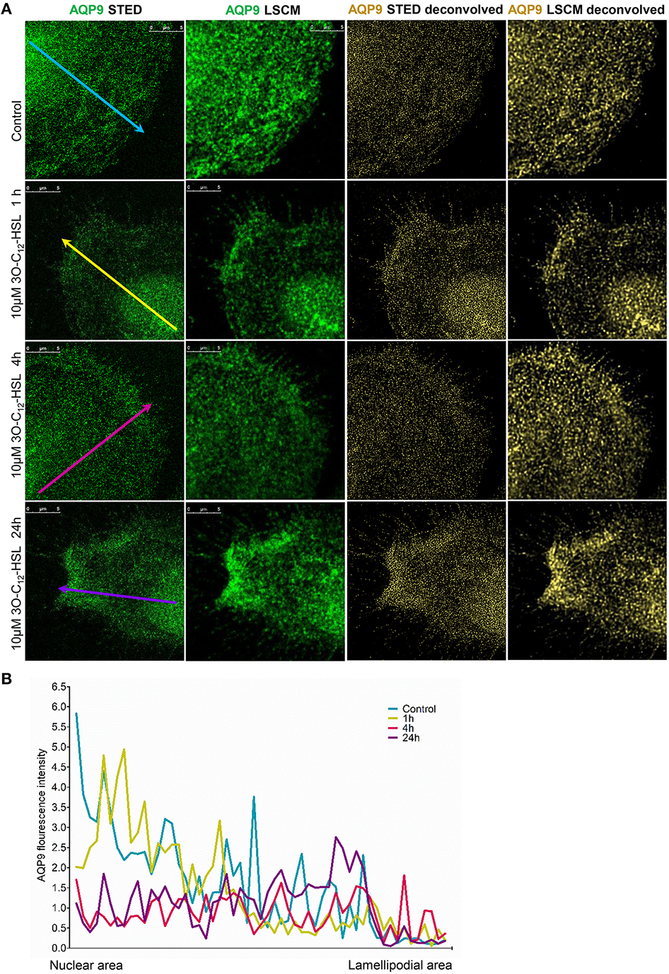 Nanoscale imaging of AQP9 architecture in 3O-C12-HSL-stimulated macrophages. (A) Macrophages were stimulated with 10ÎĽM 3O-C12-HSL for 1, 4 or 24 h, or 0.02% DMSO as a vehicle control (Control), stained for AQP9 (green) and analyzed with STED nanoscopy. The two left panels show the images after Huygens deconvolution (gold) with improved visualization quality. Bar 5 ÎĽm. (B) AQP9 fluorescence intensity profiles over the cells, measured as indicated by colored arrows in (A) in the direction from nuclear to lamellipodial area on the representative images.