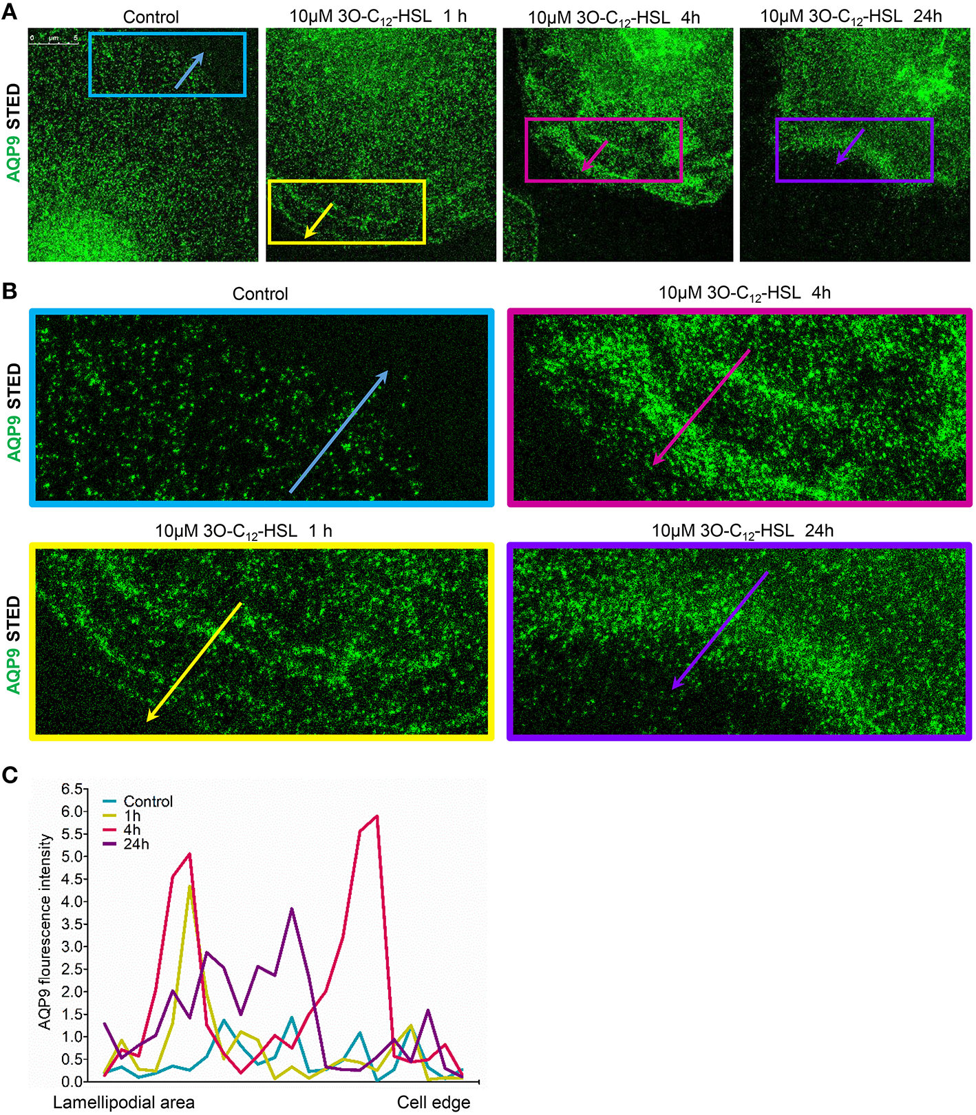 Nanoscale visualization of AQP9 dynamic in lamellipodial area in 3O-C12-HSL stimulated macrophages. Macrophages were stimulated with 10 ÎĽM 3O-C12-HSL for 1, 4, or 24 h, or 0.02% DMSO as a vehicle control (Control), stained for AQP9 (green) and analyzed with STED nanoscopy. (A) Main panels, bar 5 ÎĽm. (B) Inserts, image size is 15.5 Ă— 6.2 ÎĽm. (C) AQP9 fluorescence intensity profiles measured as indicated by colored arrows in (A, B) in the direction from lamellipodial area to the edge of macrophages on the representative images.