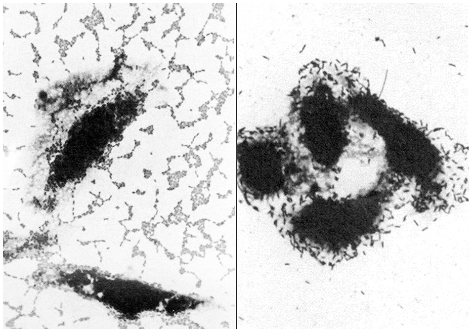 Light micrographs showing the distinctive patterns of adherence of enteroaggregative E. coli (left) and diffusely-adherent E. coli (right) to cultured epithelial cells (adapted from Nataro et al., 1987). These patterns were responsible for the names of these pathotypes and were originally used to identify them in vitro.