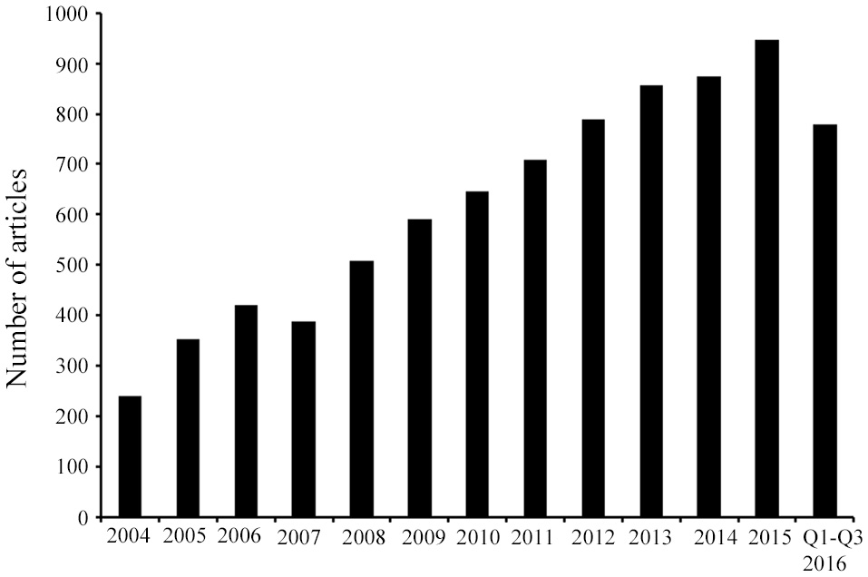 Published research on AMPs identified from 2004 until September 2016. Article counts were carried out after searching in PubMed using the following key words: antimicrobial peptides, AMPs, and/or host defense peptides. The search results demonstrate that in the last decade the AMP research field has progressively expanded as represented by the continuous increase in the number of articles. Q, quarter.
