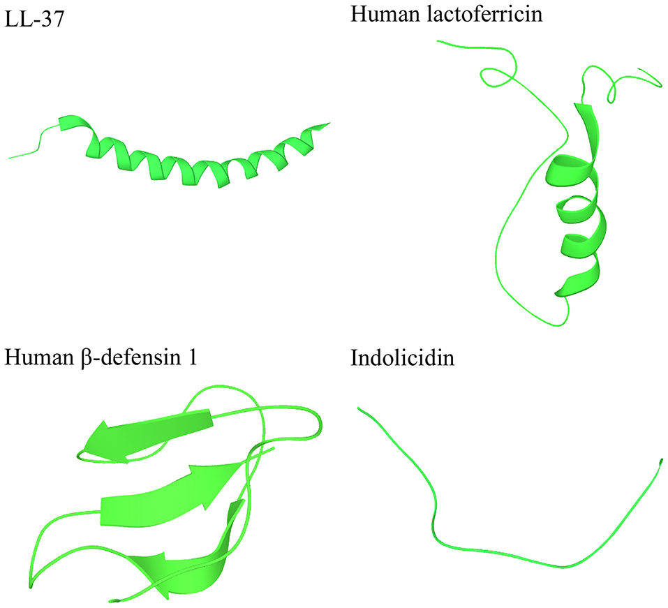 Peptides representing the three main categories of the secondary structures of AMPs. LL-37 and human lactoferricin represent α-helical peptides, human β-defensin 1 represents β-sheet peptides, and indolocidin represents extended/random-coil structures. Structures are from Protein Data Bank in Europe (PDB id codes 2k6o, 1z6v, 1kj5, and 1g89).