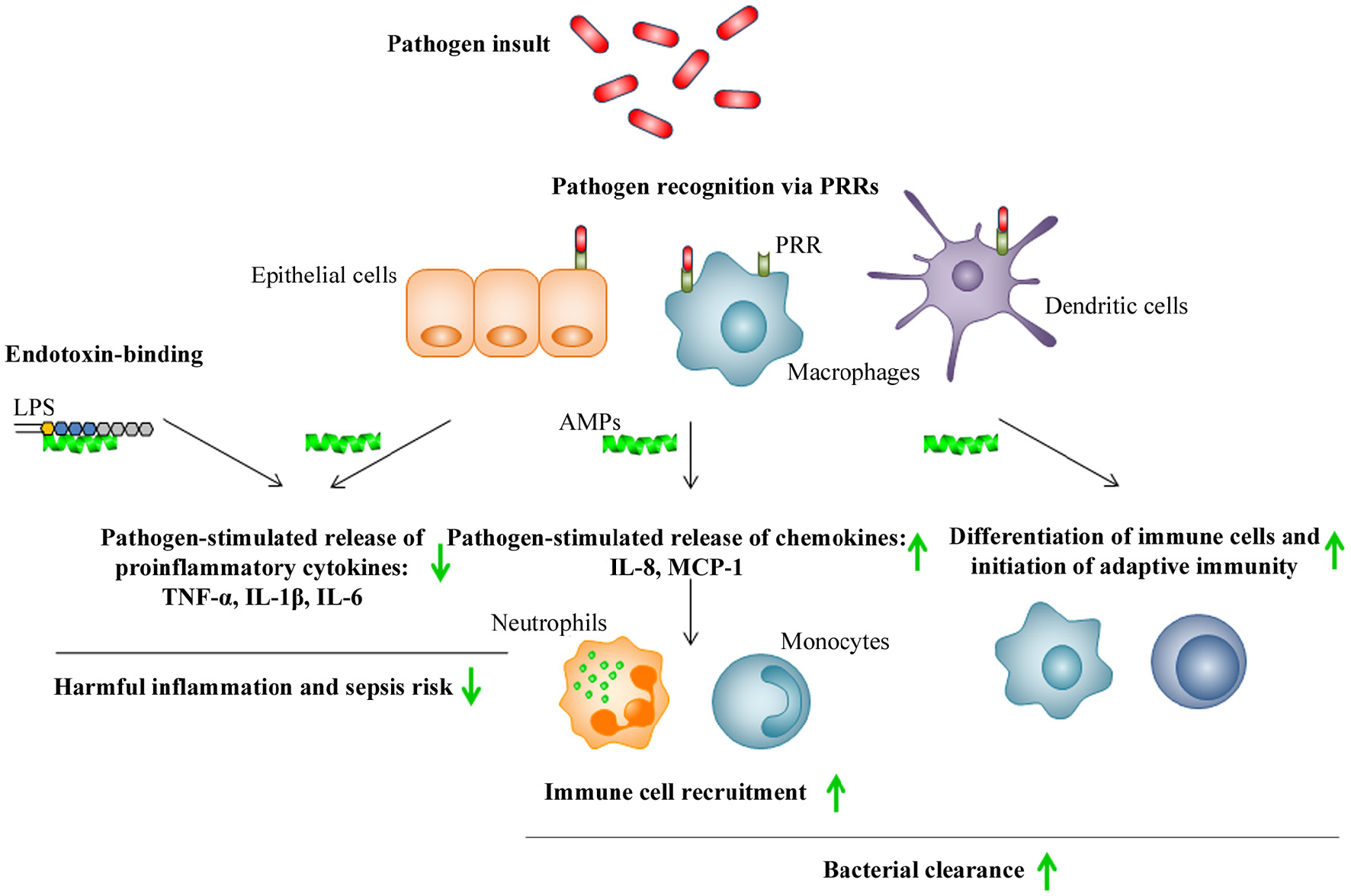 Schematic illustration of immunomodulatory activities of AMPs. Pathogen recognition via pathogen recognition receptors (PRRs), such as TLRs, by epithelial cells, macrophages, and dendritic cells, leads to killing via phagocytosis as well as release of proinflammatory cytokines and chemokines by these cells, that subsequently stimulates the recruitment of additional immune cells to the site of infection. In addition, pathogen insult will lead to maturation of dendritic cells and subsequent initiation of adaptive immunity. AMPs indirectly promote pathogen clearance by stimulating chemotaxis and immune cell differentiation, while also preventing harmful inflammation and sepsis by inhibition of proinflammatory cytokine release and direct scavenging of bacterial endotoxins such as LPS. Up- or down-regulation of responses by AMPs is indicated by green arrows.