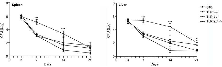 Figure 1. The absence of both TLR2 and 4 affects the control of B. microti infection in spleen and liver. TLR2−/−, TLR4−/− and TLR2×4−/− mice were infected i.p. with B. microti (105 CFU) and the number of CFU in spleen and liver was determined 3, 7, 14, or 21 days later. Data are presented as mean ± SEM of 10–25 biological replicates performed in 4 independent experiments; Statistical analyses was performed by one-way ANOVA test with Bonferroni's post-test. ***P < 0.001, comparing each group with the control group (WT B10).