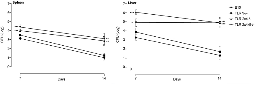 Figure 2. TLR9 is not necessary for the control of B. microti infection in spleen and liver. WT B10, TLR9−/−, TLR2×4−/− and TLR2×4×9−/− mice were infected i.p. with B. microti (105 CFU) and the number of CFU in spleen and liver was determined 7 and 14 days later. Data are presented as mean ± SEM of 7–12 biological replicates performed in 2 independent experiments; Statistical analyses was performed by one-way ANOVA test with Bonferroni's post-test. *P < 0.05; **P < 0.01; ***P < 0.001, comparing each group with the control group (WT B10).