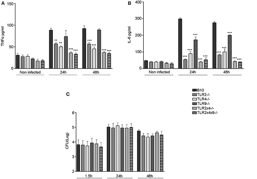 As shown in Figures 3A,B, the absence of either TLR2 or TLR4 significantly reduced the production of TNFα (Figure 3A) and IL6 (Figure 3B) after 24 and 48 h of infection. TLR9 deficiency did not affect TNFα production and only slightly reduced IL6 generation. When TLR2 and TLR4 or TLR2, TLR4 and TLR9 were absent, TNFα and IL6 generation was reduced to basal (non-stimulated control) levels.