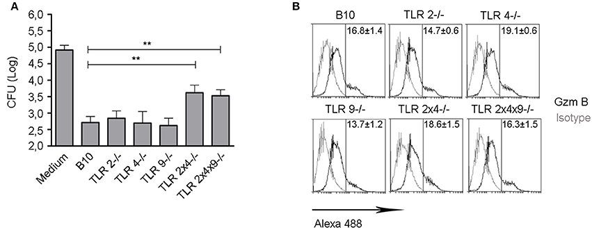 Figure 5. B. microti- specific ex vivo Tc cells from mice lacking TLR2 and TLR4 show a lower capacity to inhibit B. microti replication in BMDM. (A) WT B10, TLR2−/−, TLR4−/−, TLR9−/−, TLR2×4−/− and TLR2×4×9−/− mice were infected with B. microti i.p. (105 cfu). Seven days later, CD8+ cells were enriched from spleen using MACS and incubated with BMDM from WT B10 mice infected with B. microti. After 24 h, cells were lysed and the number of CFU was determined. Data are presented as mean ± SEM from three independent experiments performed by triplicates. Statistical analyses was performed by one-way ANOVA test with Bonferroni's post-test. **P < 0.01, comparing each group with the group treated with WT B10 Tc cells. (B) Intracellular expression of granzyme B was analyzed in MACS-enriched CD8+ cells. A representative experiment from two independent studies is shown.